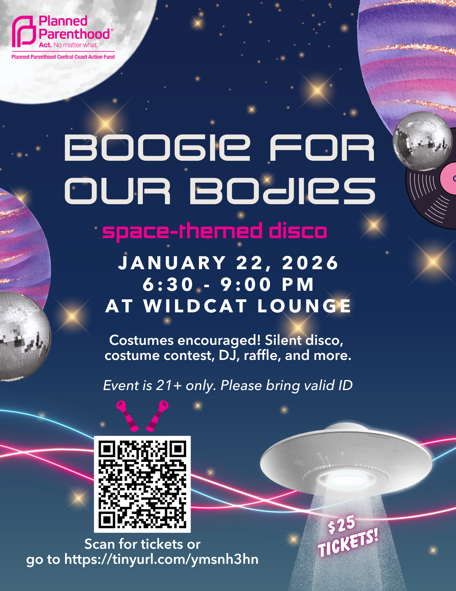 Join us for Boogie for Our Bodies 2026, a space-themed disco at the Wildcat Lounge.