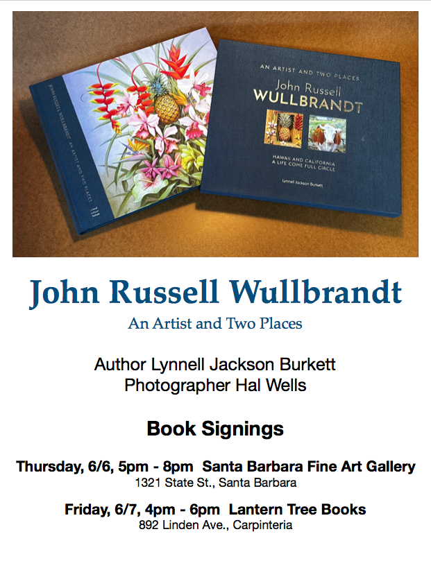 Lynnell Burkett wil be signing copies of “John Russel Wullbrandt: An Artist and Two Places” on 6/6 5-8pm at the Santa Barbara Fine Art Gallery and and 6/7 4-6pm at Lantern Tree Books.