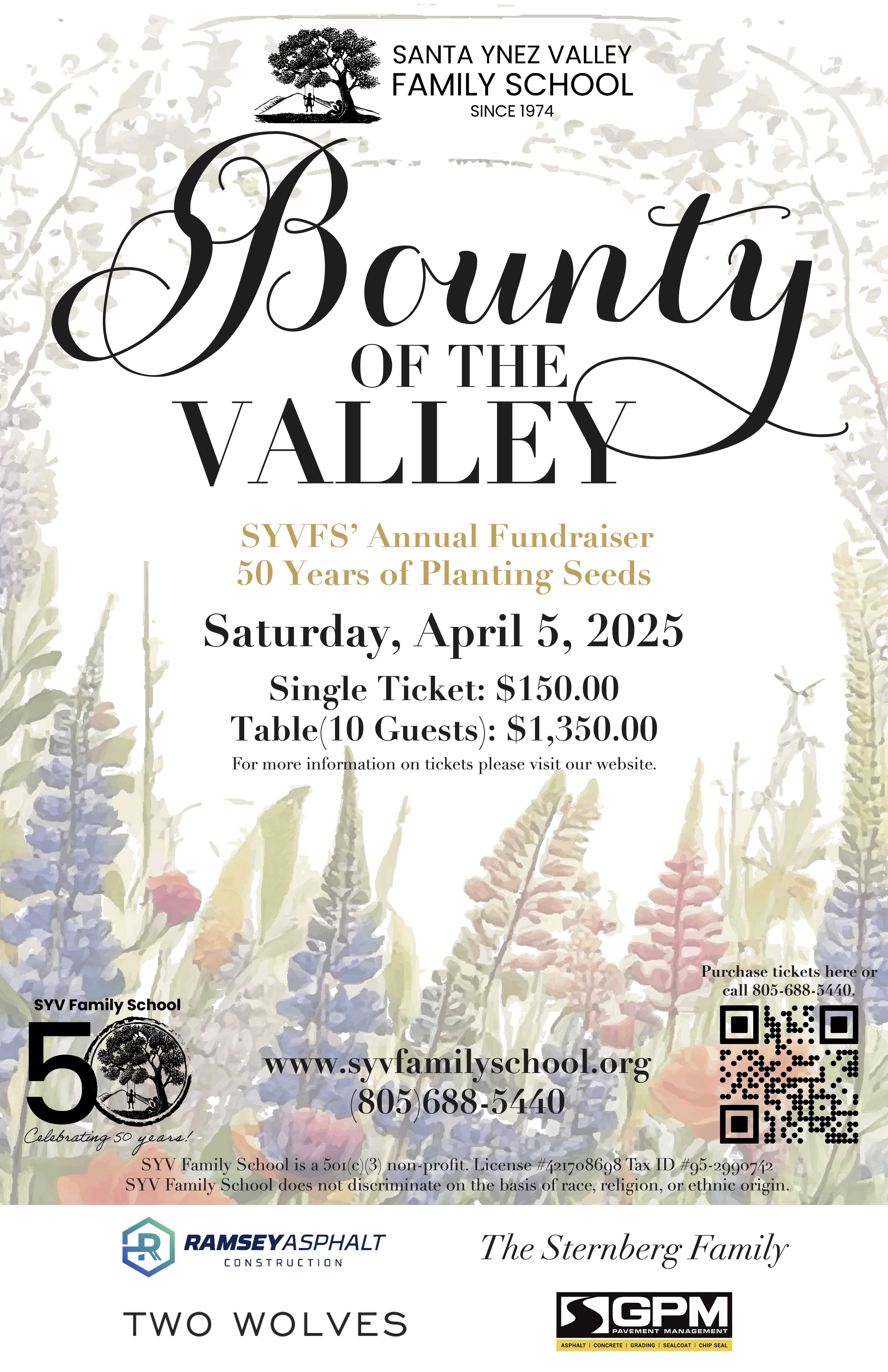 For more information, to RSVP, or to learn about sponsorship opportunities, please visit https://www.syvfamilyschool.org/bountytickets or contact our staff at fiftiethanniversary@syvfamilyschool.org or call the office at 805-688-5440.