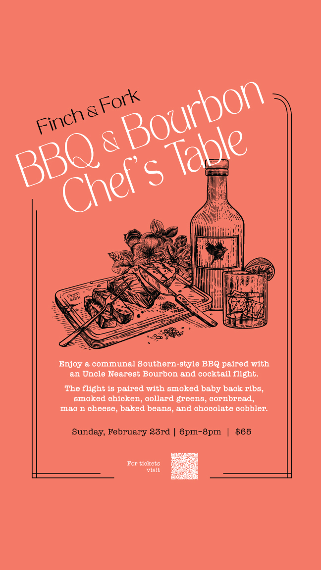 Enjoy a Southern-style BBQ spread paired with an Uncle Nearest bourbon and cocktail flight at Finch & Fork on February 23, from 6-8pm!