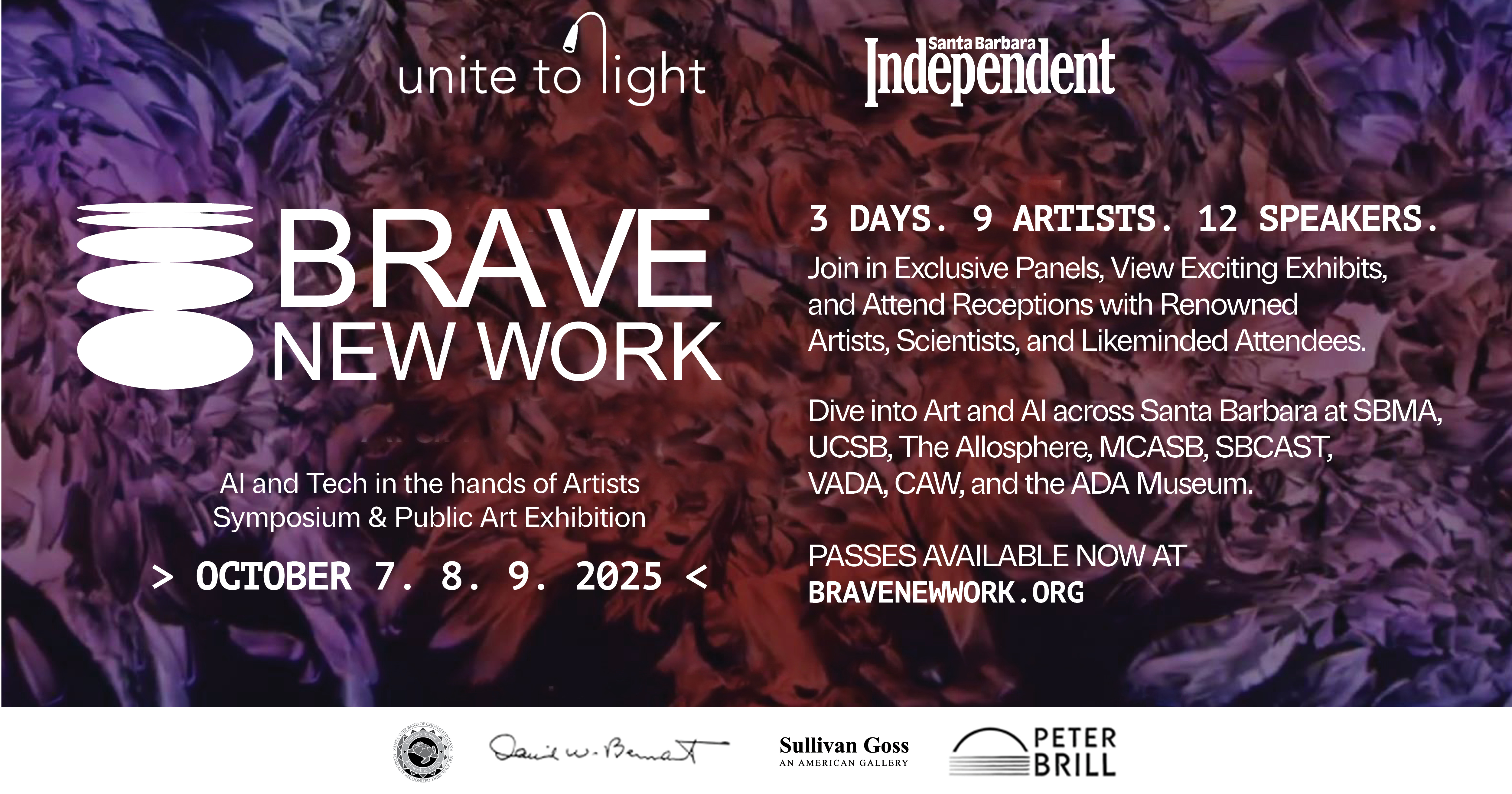 “Brave New Work: AI and Tech in the Hands of Artists” is a contemporary art exhibition and three-day symposium in Santa Barbara showcasing internationally recognized artists and speakers who are utilizing exciting new technologies to tell compelling stories centered on the environment, cultural identities, and community. City-wide, this event includes networking opportunities, casual receptions, and public art.