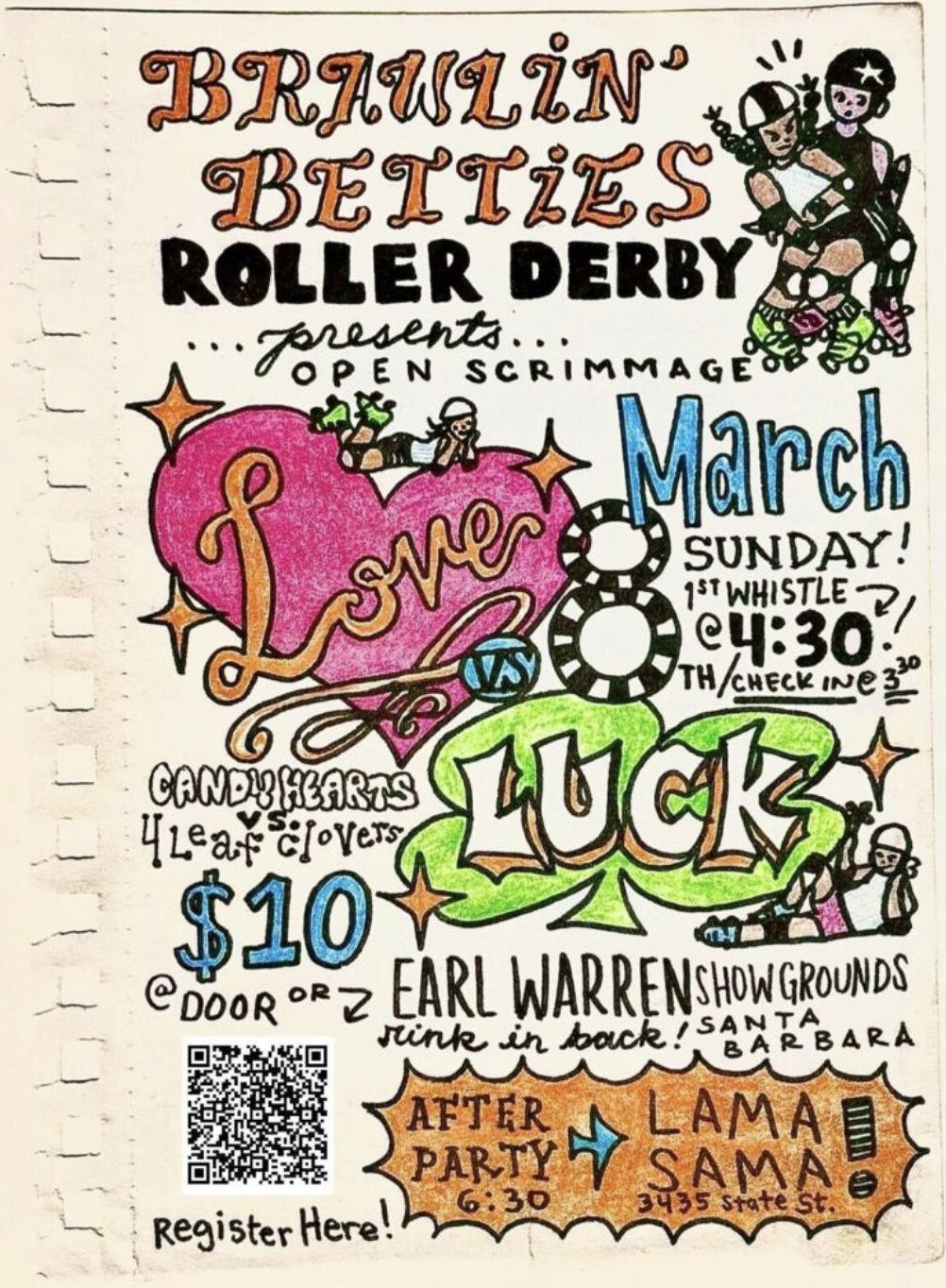 Join us immediately following last whistle for our after party. Where: Lama Dog Uptown, 3435 State Street, Santa Barbara 93105 When: 6:30PM on Sunday, March 8, 2026 What: Grab some delicious food and beverages while you chat with the skaters and make new friends.