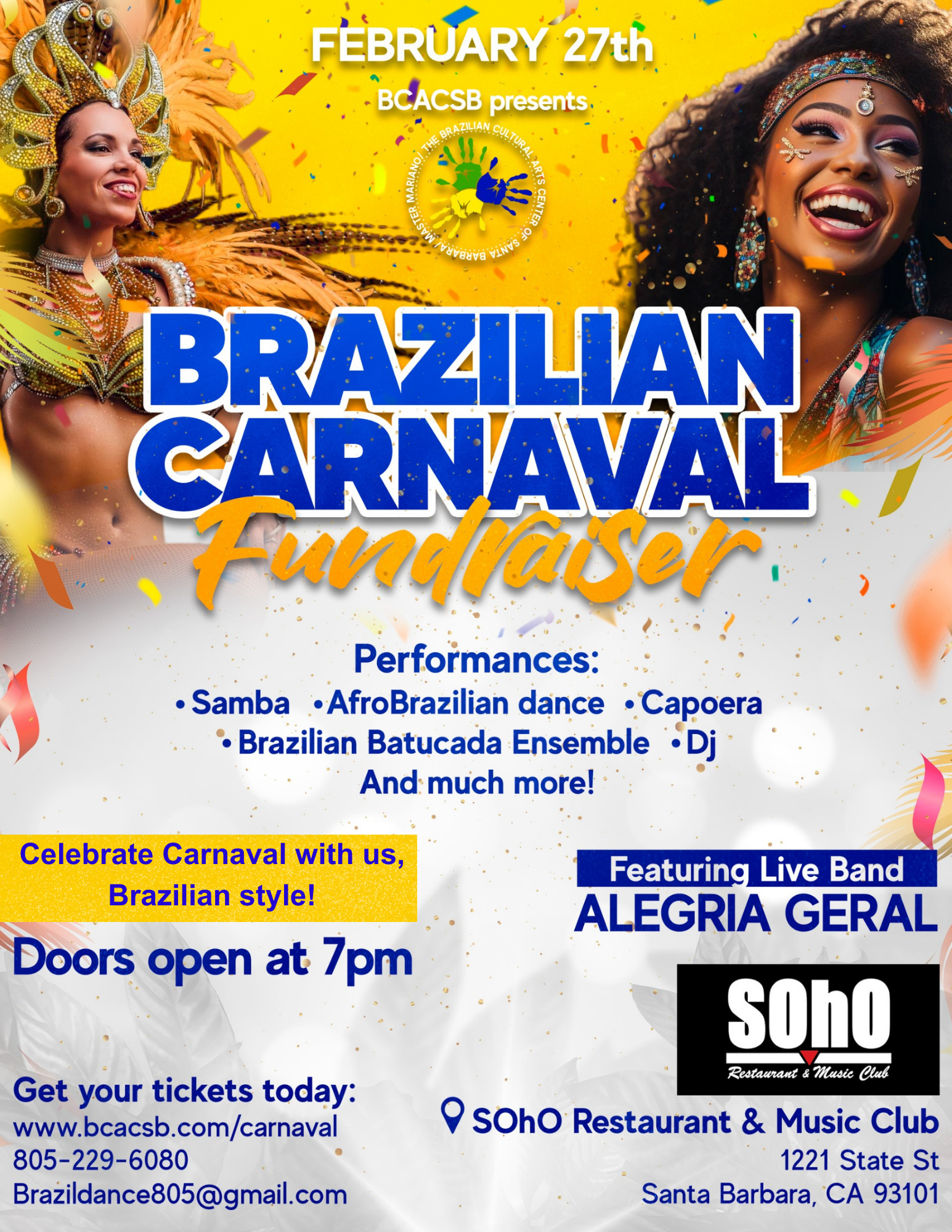 By attending, you’re directly supporting the Brazilian Cultural Arts Center as well as Live Music Venues like SOhO – expanding access to music, movement, art, and cultural education in the heart of downtown Santa Barbara!