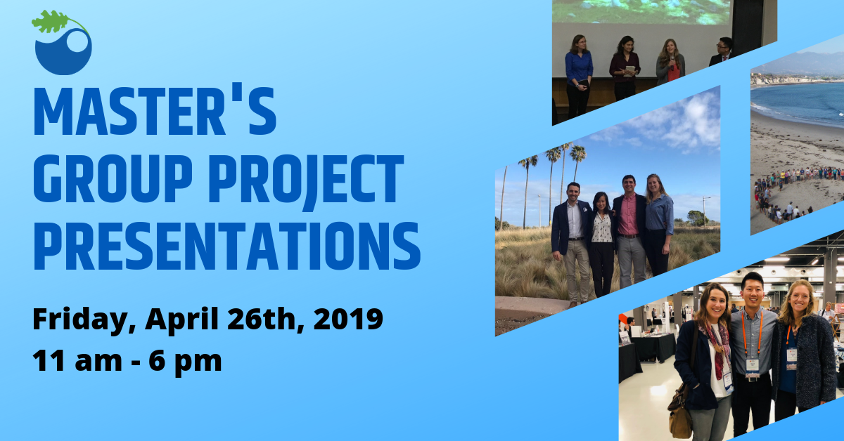 Join the UCSB Bren School of Environmental Science & Management for our annual presentation of Master’s Group Projects, Friday, April 26, 1 – 5pm at the Hilton Santa Barbara Beachfront Resort, 633 East Cabrillo Boulevard, Santa Barbara. This event is free and open to the public. Poster session and reception to follow the presentations.