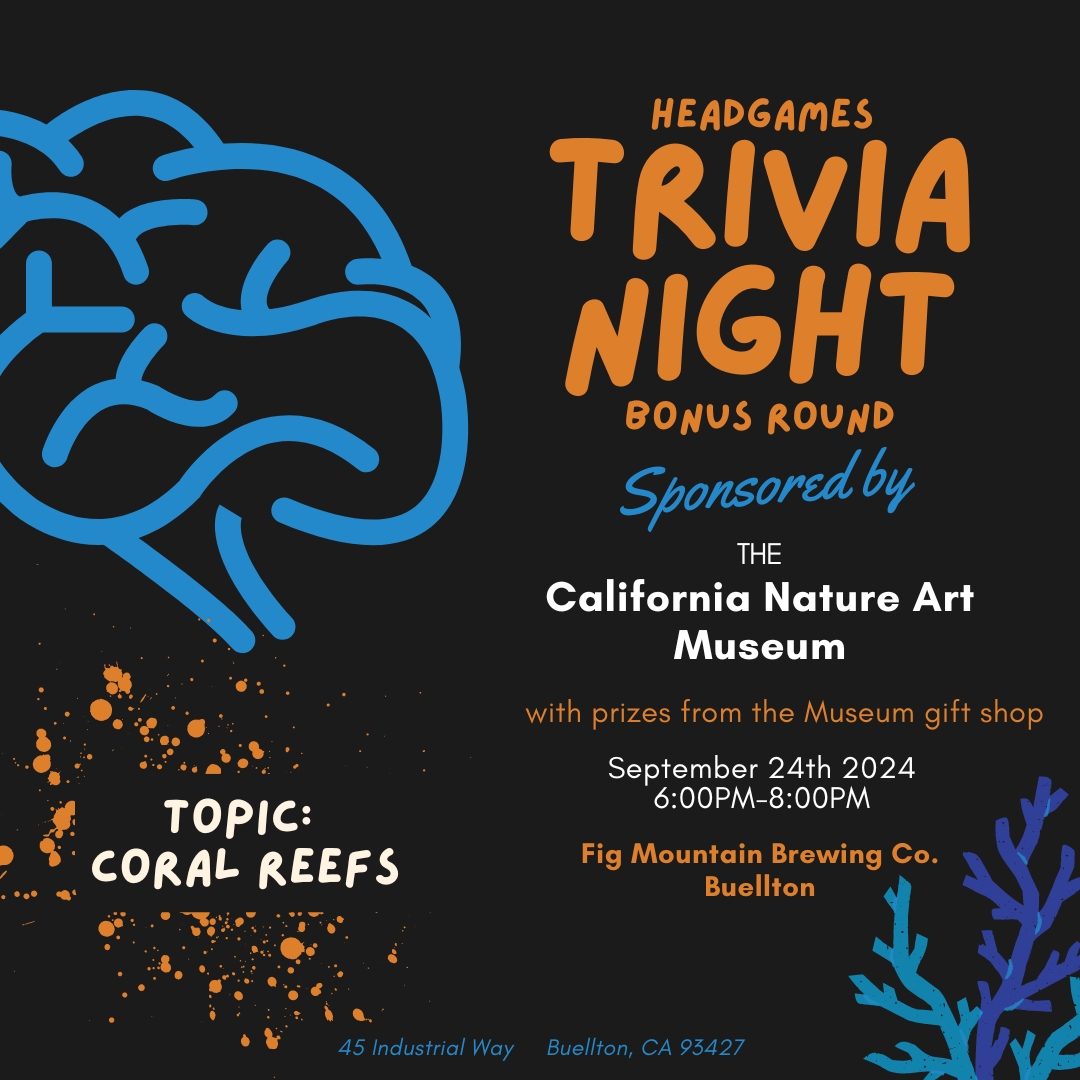 Join the California Nature Art Museum and Headgames Trivia for a special bonus round of trivia on coral reefs in celebration of the opening of our latest exhibition, “A Deeper Love: New Paintings Inspired by Coral Reefs” on September 24th 2024, from 6PM-8PM. You can expect a night of colorful competition, fun and food as we test your knowledge of one of the most precious and in-need-of-protection places in the ocean. Our sponsored bonus round will include two prizes from the Museum gift store, and will not affect players’ overall trivia score.