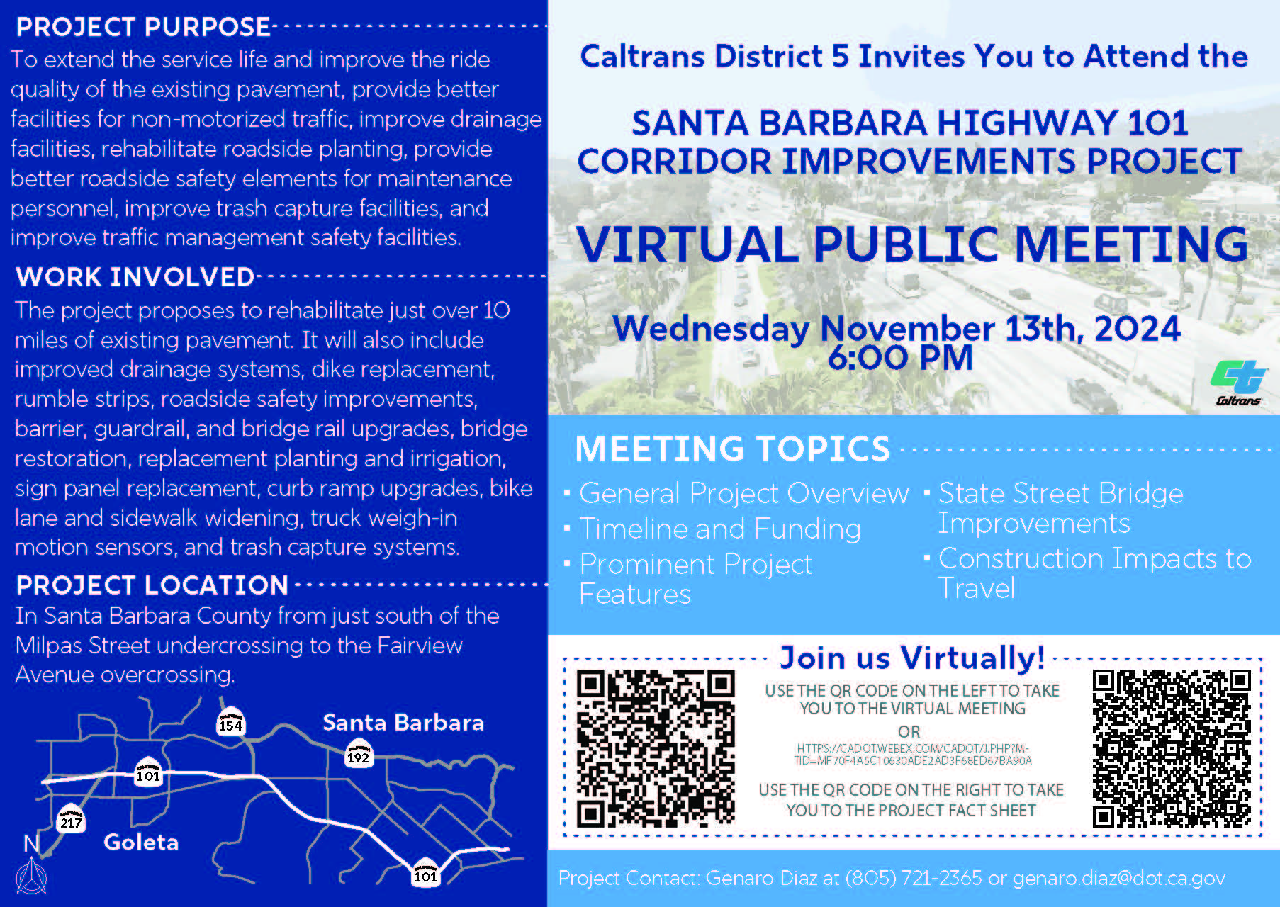 Caltrans invites the public to attend a virtual information meeting for the Santa Barbara Highway 101 Corridor Improvements Project on Wednesday, November 13 at 6:00 pm.