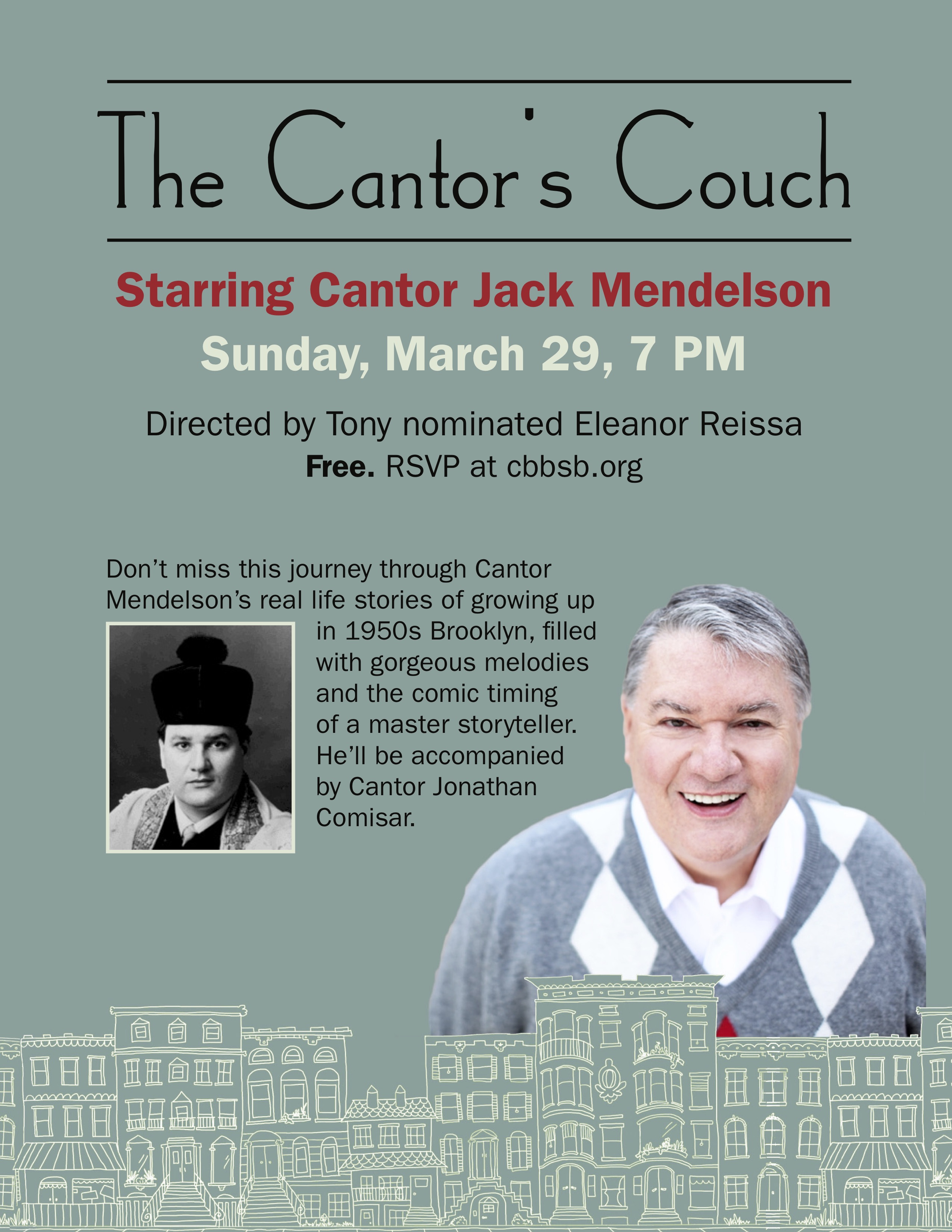 “The Cantor’s Couch” (book by Mark Bieler), is a journey through Cantor Jack Mendelson’s real life stories growing up in the 1950’s in Borough Park, Brooklyn. The son of a loving deli owner and an overbearing mother, Cantor Mendelson paints a picture of a bygone day in Jewish America when Jews would flock to synagogue to hear the golden voices of cantors as if it were a concert hall. He recounts a relatable story of a childhood riddled with anxiety and doubt, mixed with joyous memories of music and celebration — all told with the expertise and comic timing of a master storyteller. Cantor Mendelson’s collaborator and accompanist will be Cantor Jonathan Comisar, who wrote original music for this production. Directed by Tony nominated Eleanor Reissa.