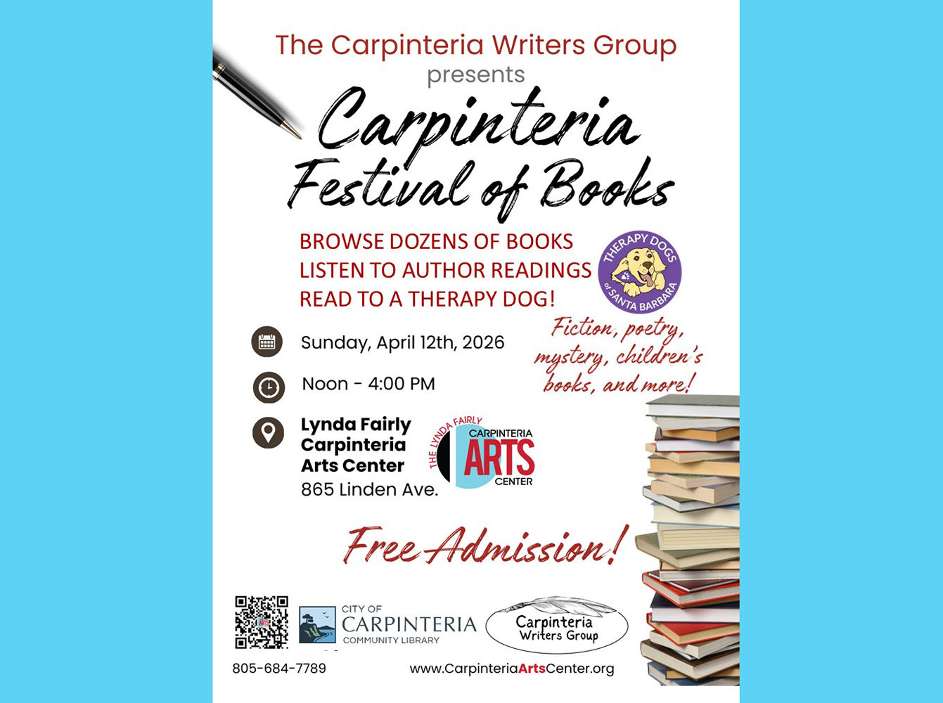 The festival is presented by the Carpinteria Writers Group and Lynda Fairly Arts Center, with support from the Carpinteria Community Library and Therapy Dogs of Santa Barbara.