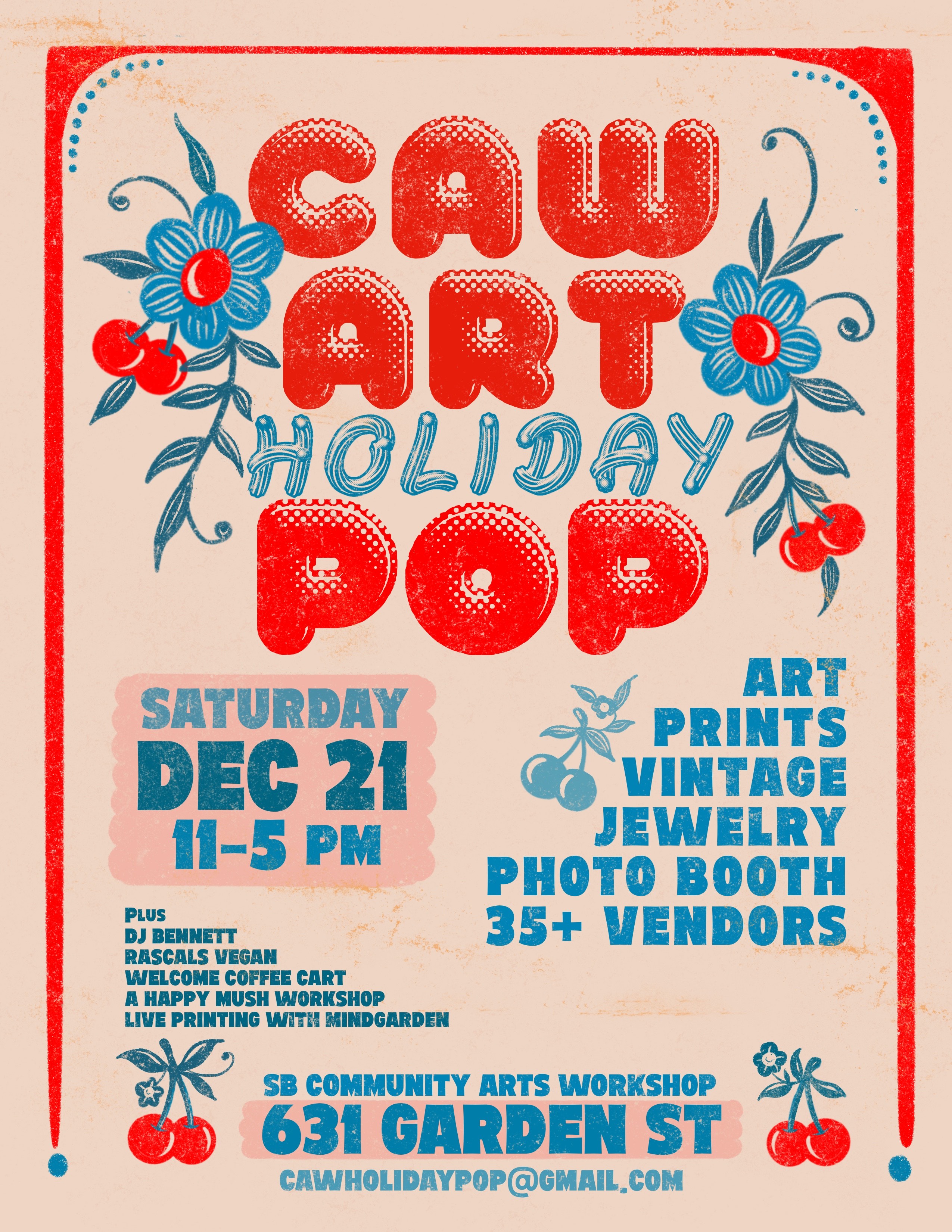 In addition to a wide range of one-of-a-kind gift options, there will be music by DJ Bennett, yummy food from Rascal’s, warm beverages by Welcome Coffee Cart, a Happy Mush Decoden Workshop, Onsite Screen Printing by MindGarden, Interactive Typewritten Poetry with Simon Kiefer, a Cher This Moment Photo Booth and a Gift Wrapping Station.
