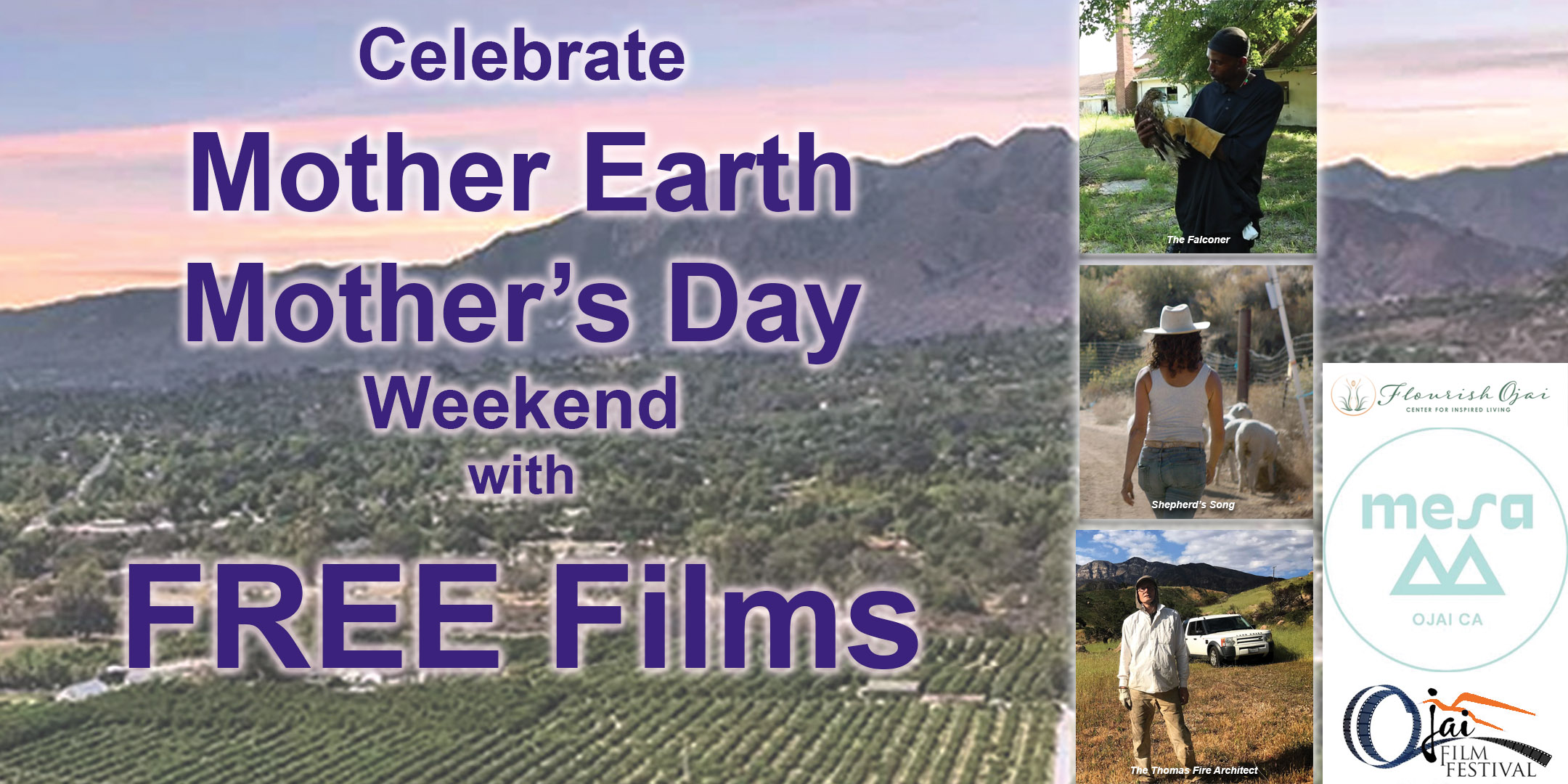 The Ojai Film Festival partners with two other local organizations to honor Mother Earth on Mother’s Day weekend. Come to Flourish Ojai, at the corner of Aliso and Canada Streets, on Saturday, May 7 for a FREE screening of three environmental films previously shown at the Ojai Film Festival. Plus, Dan Parziale and Kyle Thompson, Co-Founders of MESA, will lead a discussion on earth enriching topics related to the films. The community has two opportunities to attend this program, first at 2 p.m., then again at 7 p.m.