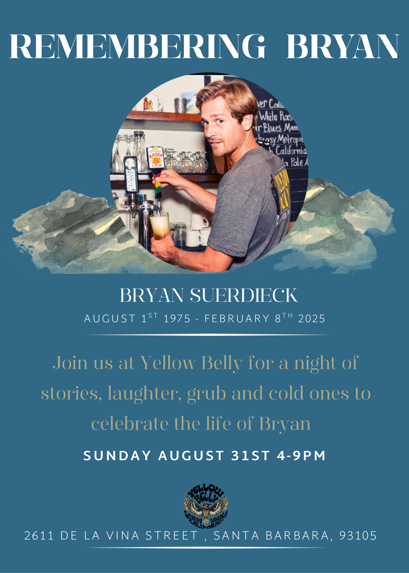 The community is invited to a Celebration Of Life in memory of our dear bartender Bryan Suerdieck on Sunday, August 31st, 4-9pm.