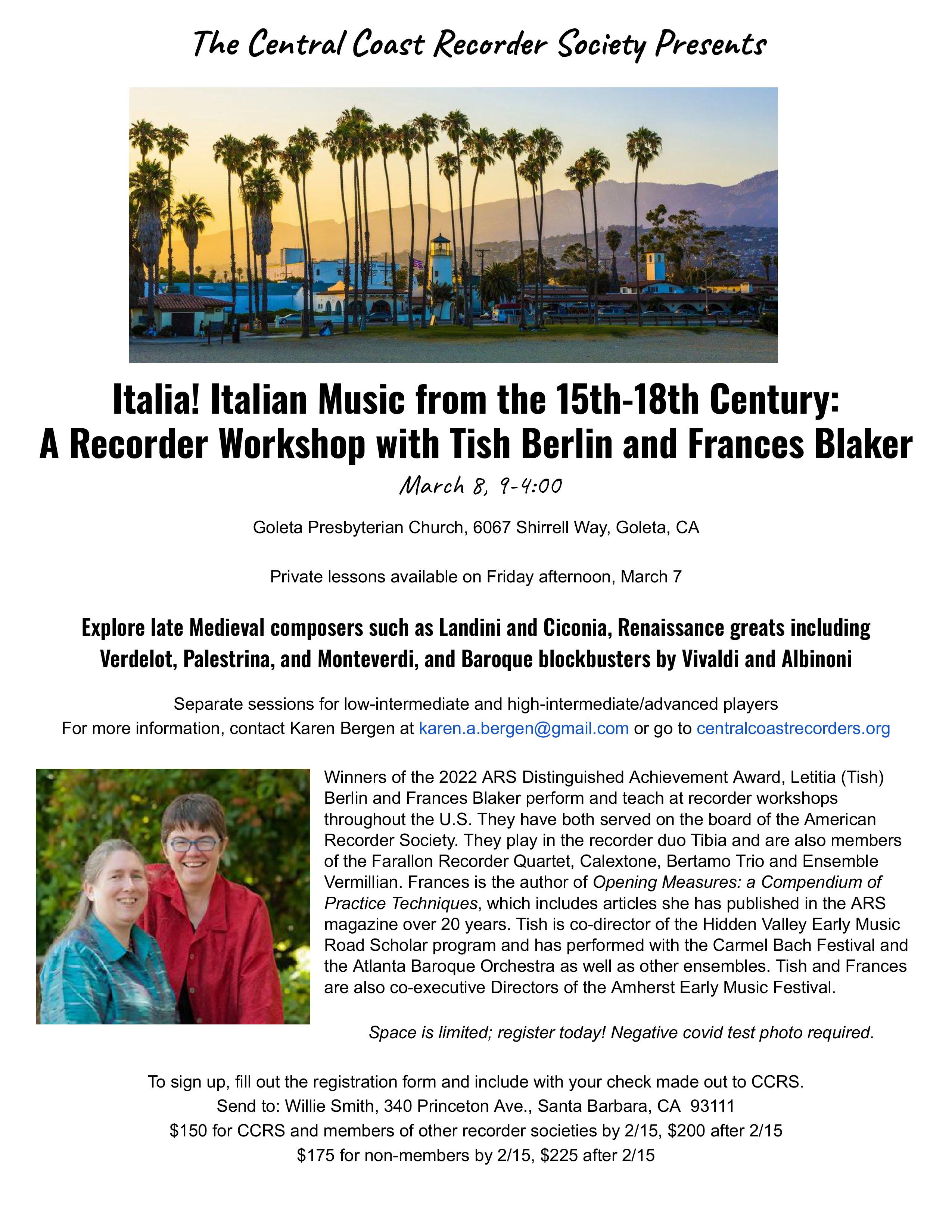 “Italia! Italian Music from the 15th-18th Century: A Recorder Workshop with Tish Berlin and Frances Blaker”