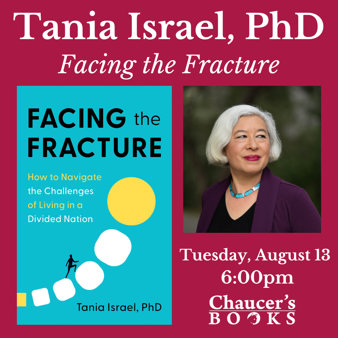 Chaucer’s Books hosts local author Dr. Tania Israel for an in-store book talk and signing of her book Facing The Fracture:How to Navigate the Challenges of Living in a Divided Nationon Tuesday, August 13 at 6 p.m.