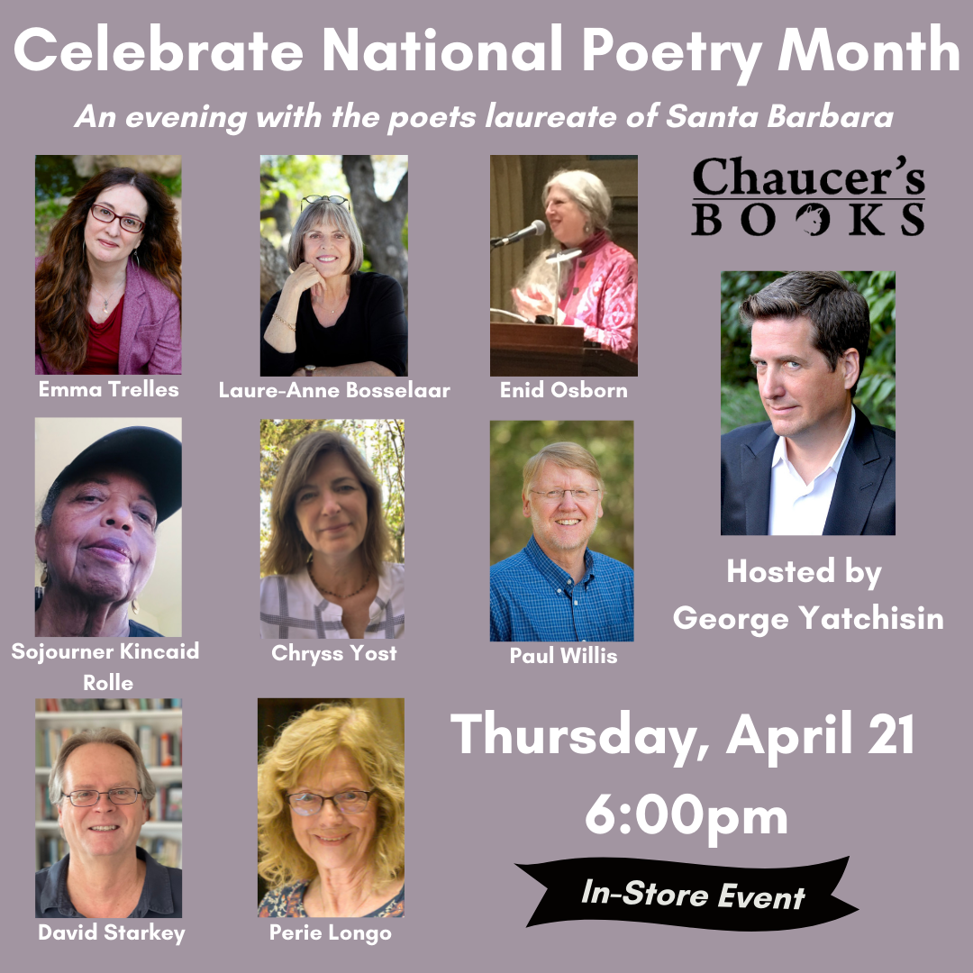 On Thursday, April 21 at 6 p.m., please join Chaucer’s Books for a Poetry Month celebration with the Poets Laureate of Santa Barbara! Laureates Perie Longo , Paul Willis , Chryss Yost , Sojourner Kincaid Rolle , Enid Osborn , Laure-Anne Bosselaar and Emma Trelles (current) will share poetry, while the works of David Starkey , who is currently overseas, and the late Barry Spacks (2005-’07) will also be read.