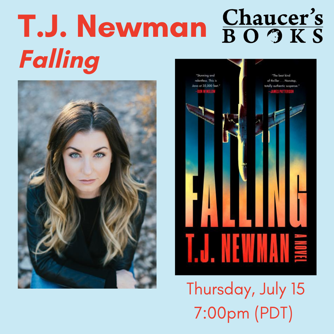 This could be the must-read of all summer offerings, and Chaucer’s books is  so pleased to have former bookseller and flight attendant turned author T.J. Newman join us virtually on July 15 (7 p.m. Pacific)!