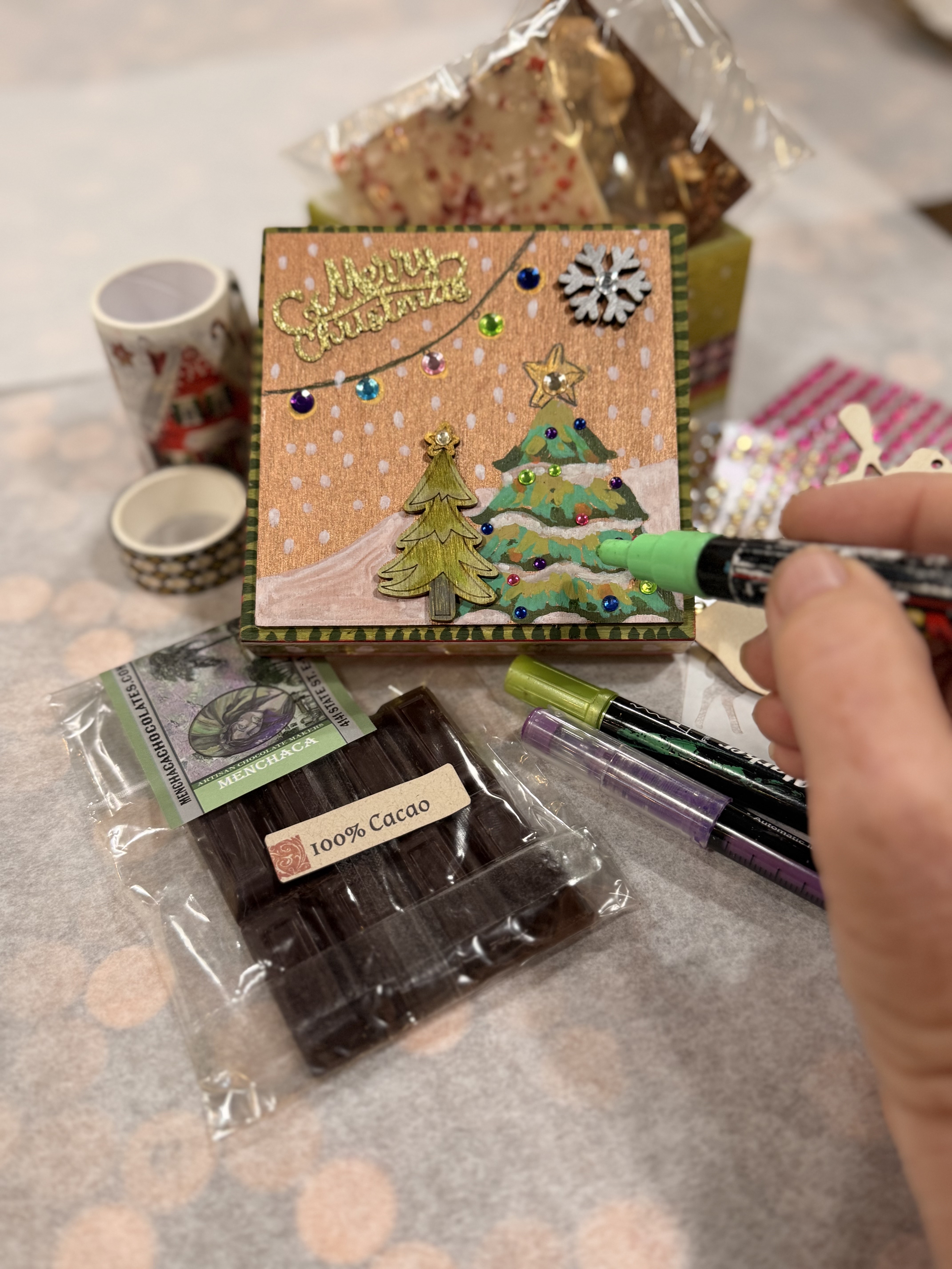 Here is where you design, paint and embellish a wooden box AND then personally curate the craft chocolate bars to put inside.
