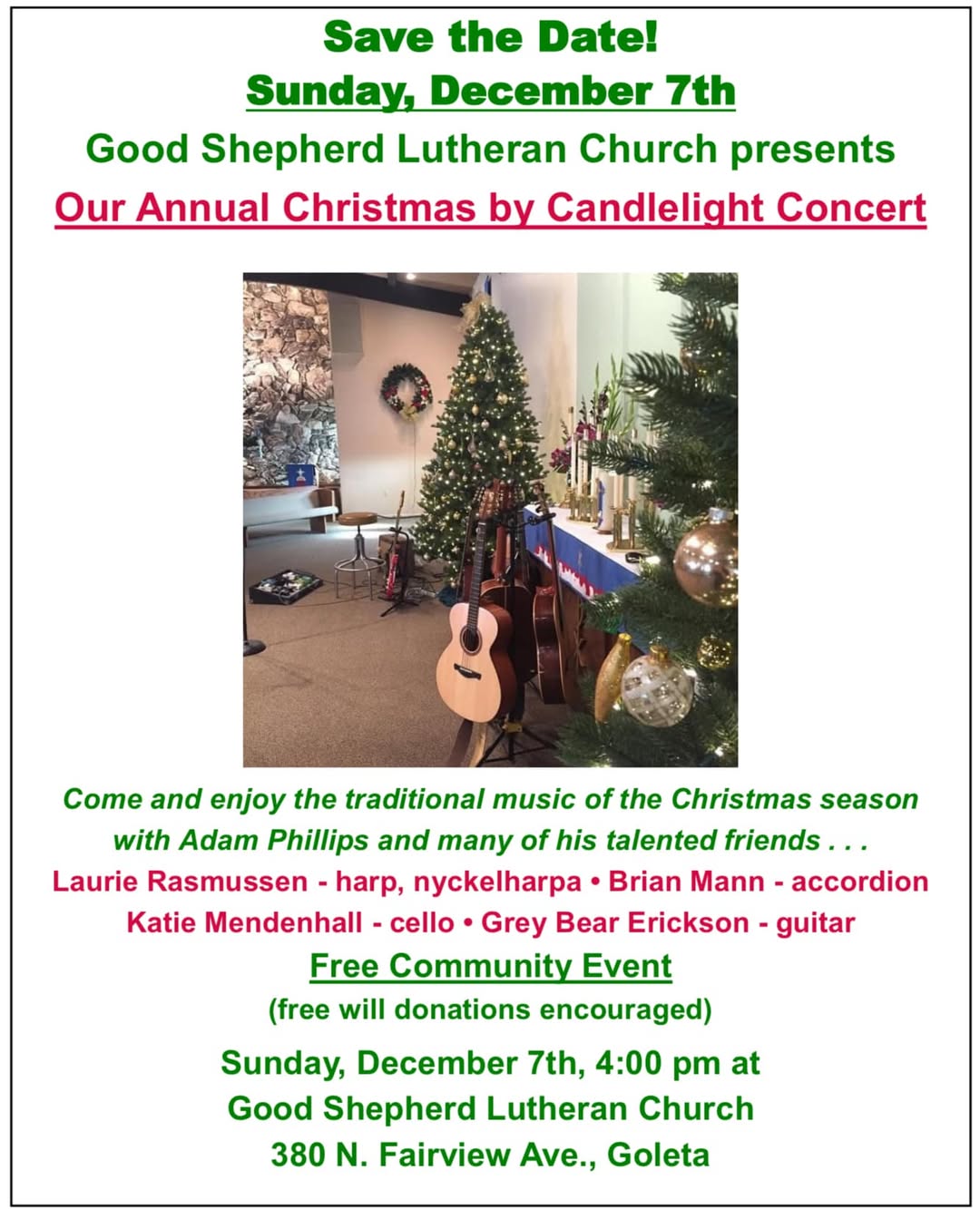 Adam Phillips, Founder of Folk Orchestra Santa Barbara, and the Music Director of Good Shepherd lutheran Church will be performing his Annual Christmas Concert from Good Shepherd Lutheran Church!
