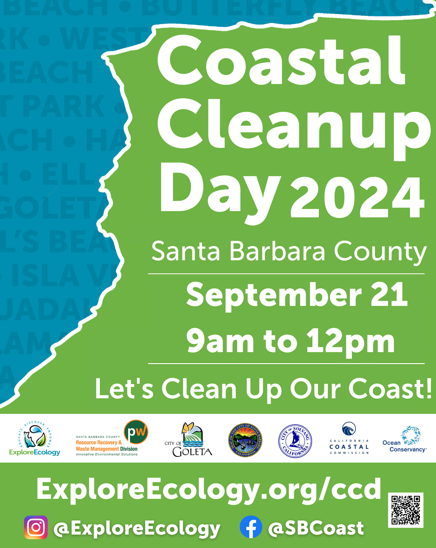Coastal Cleanup Day is brought to you by Explore Ecology and our partner the County of Santa Barbara Resource Recovery and Waste Management, with support from the Cities of Santa Barbara, Goleta, and Solvang. The California Coastal Commission organizes the statewide event and the international event is organized by the Ocean Conservancy.