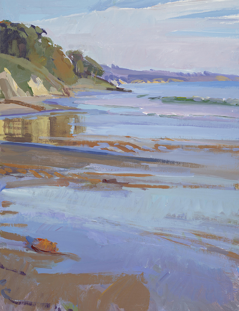 Marcia Burtt and Anne Ward bring us closer to the ocean, expanding vistas of the shoreline right up to where the artists stood with their easels in the wet sand. The greater curve of the coast and repetitively breaking waves pull us into their day at the beach.
