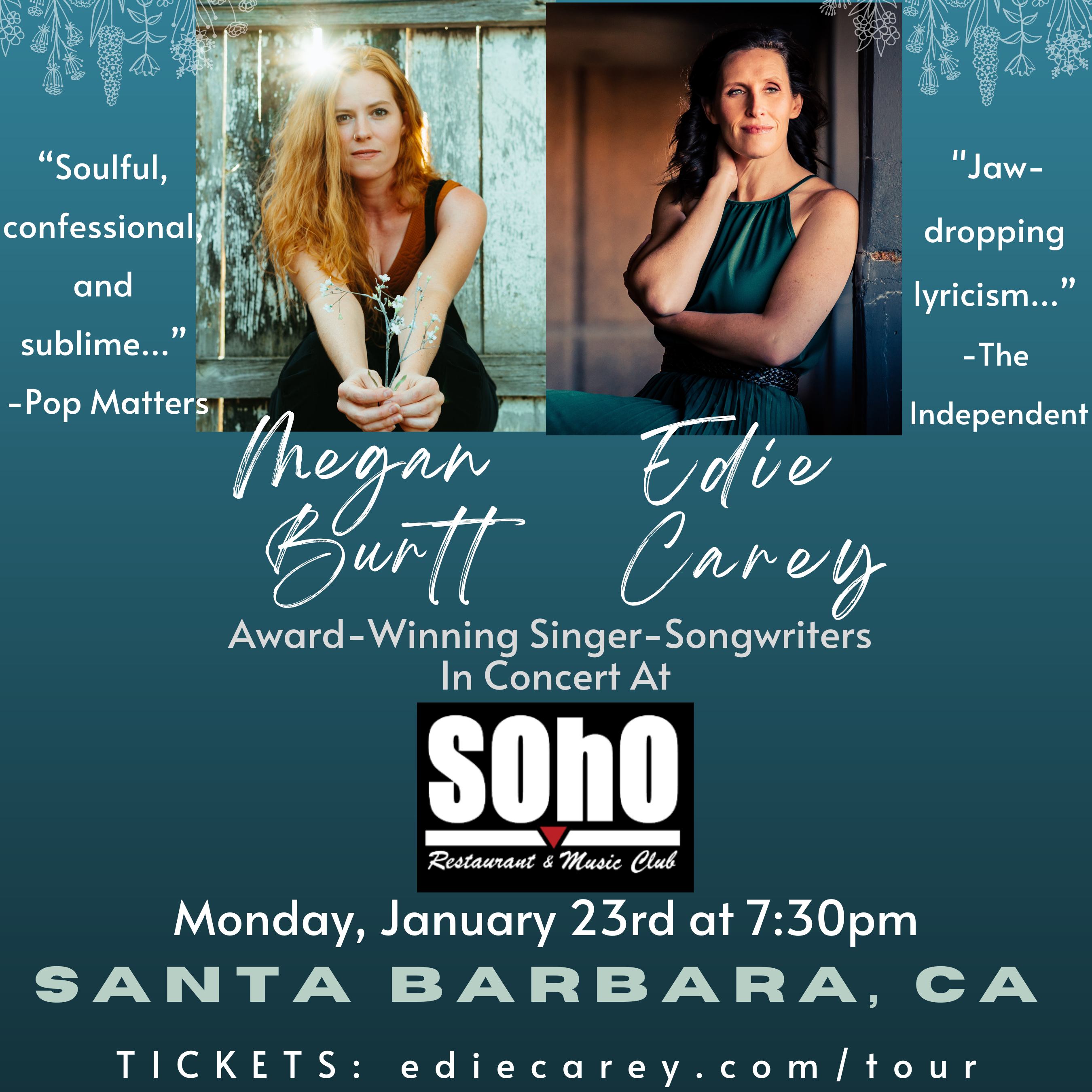 Award-Winning Colorado-Based Singer-Songwriters Edie Carey and Megan Burtt live in concert at SOhO January 23rd at 7:30. Doors at 6:30. Tickets $18 in advance / $20 at the door.