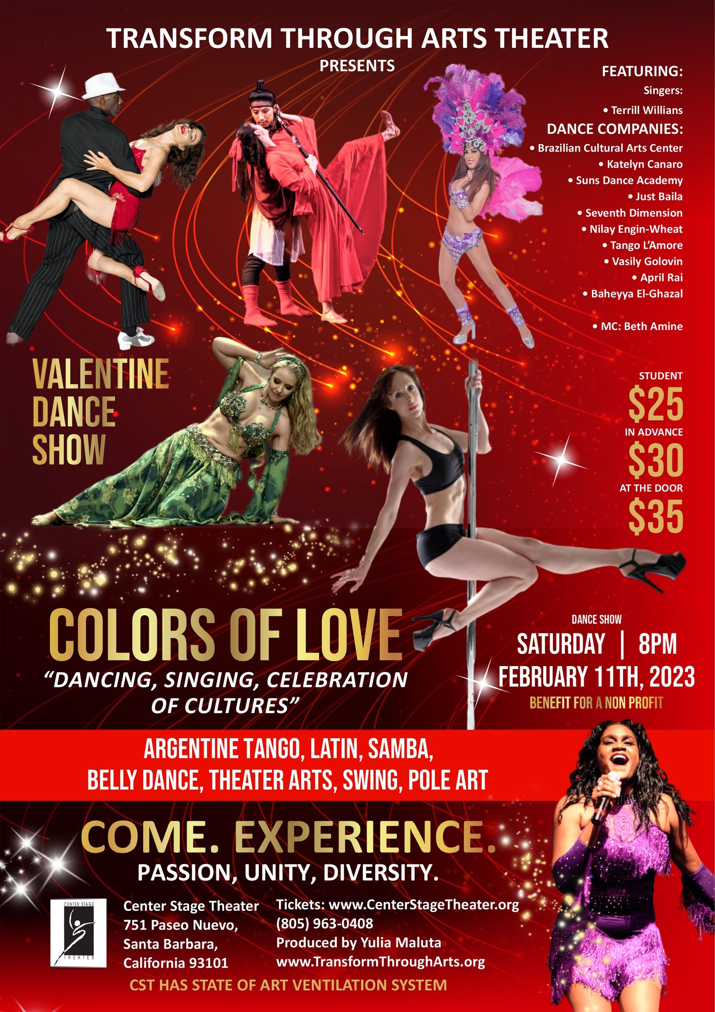 Colors of Love is a variety Valentine dance show that features professional dancers and singers, together they blend their unique talents into a powerful expression of love. Acts will range from Latin dance, Belly dance, Argentine Tango, Samba, Swing, Pole Art and more.