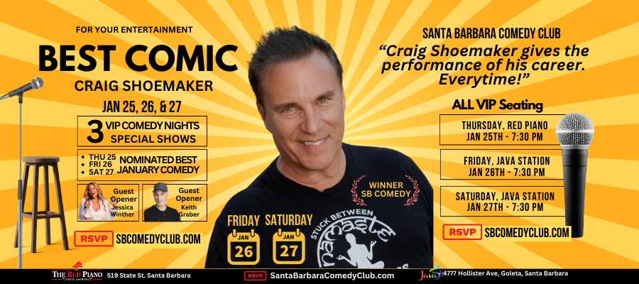 Experience the legendary Craig Shoemaker up close and personal. All shows are VIP seating in an intimate setting. You will laugh like you’ve never laughed before. Produced by the “Santa Barbara Comedy Club”. We bring weekly headliner comedy to Santa Barbara at local hometown prices.
