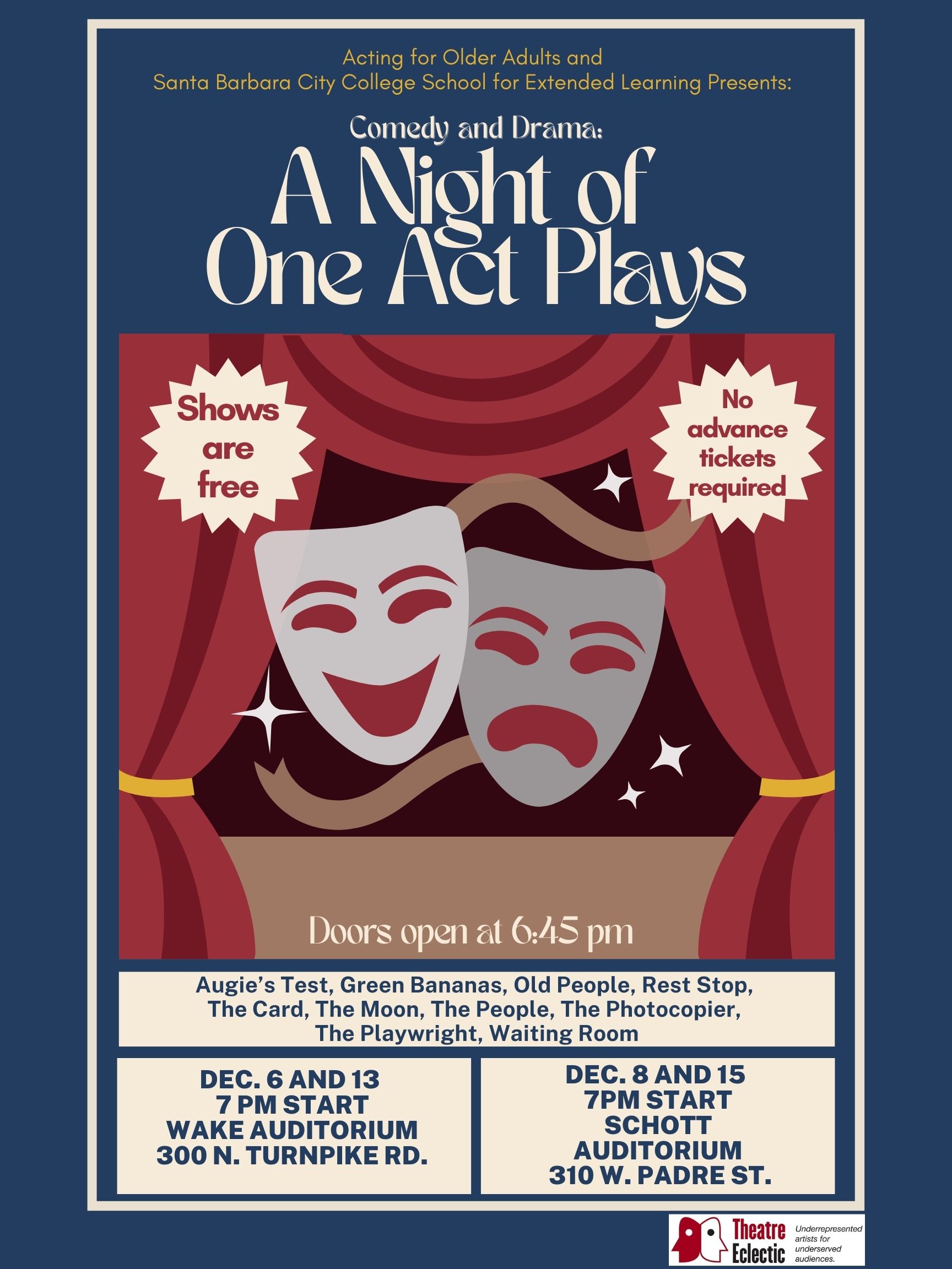SBCC School for Extended Learning, Acting for Older Adults and its production arm, Theater Eclectic, present 4 performances of Comedy & Drama: A Night of One Act Plays, all by both local and nationally-recognized playwrights.