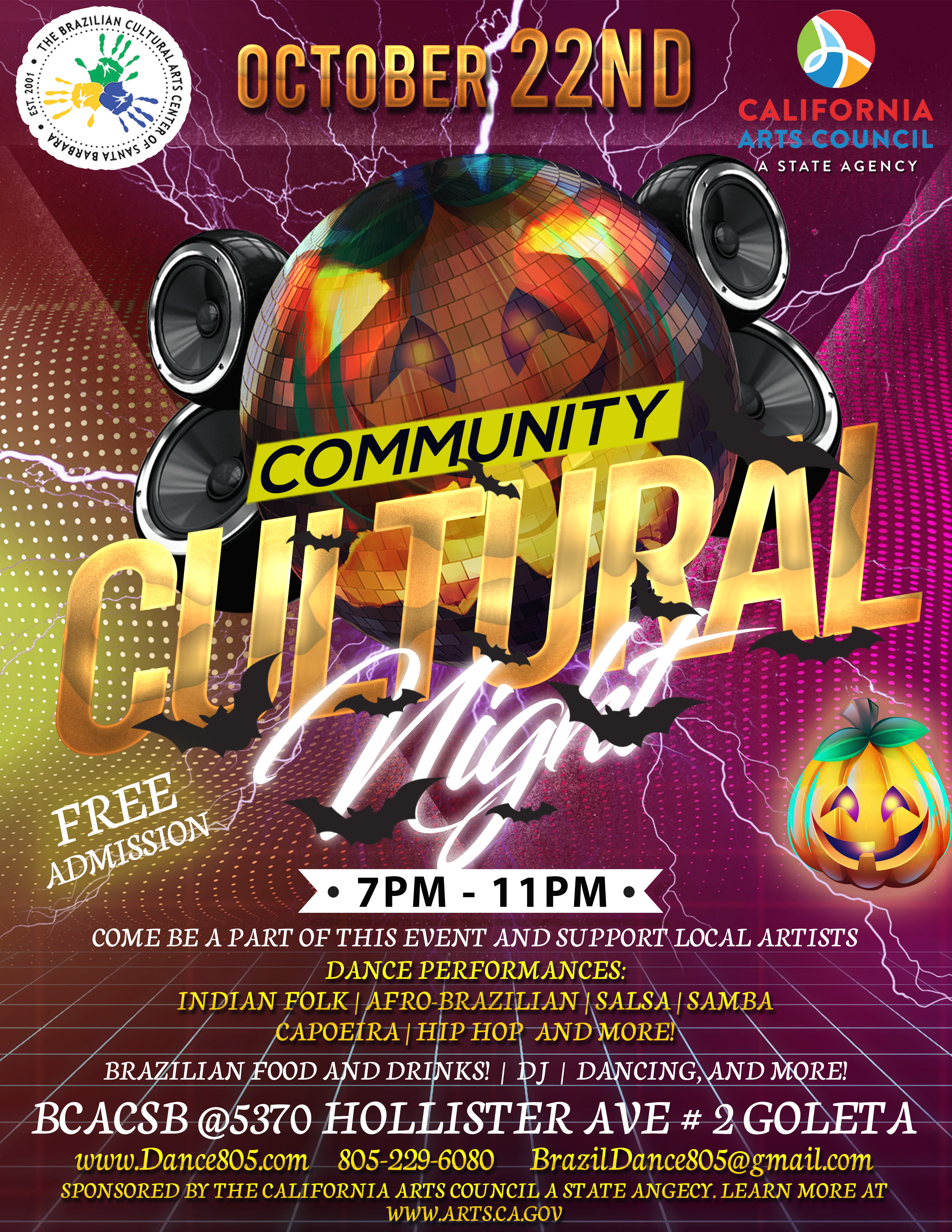 Join us for Community Cultural Night in Goleta on Saturday October 22nd from 7pm – 11pm! This is Halloween themed so feel free to wear a costume!
