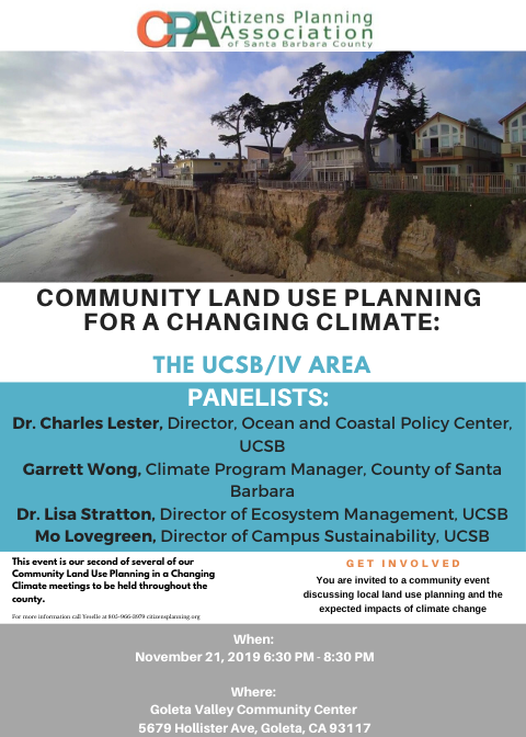 The Citizens Planning Association will host a series of panel discussions on local land use planning and the expected impacts of climate change. Our second of several events will focus on the UCSB and IV area and will be held on Thursday, November 21, at the Goleta Valley Community Center. Participants include Dr. Charles Lester, Director, Ocean and Coastal Policy Center, UCSB, Garrett Wong, Climate Program Manager, County of Santa Barbara, Dr. Lisa Stratton, Director of Ecosystem Management, UCSB, Mo Lovegreen, Director of Campus Sustainability, UCSB and our moderator, Rachel Couch, Project Manager, Coastal Conservancy Central Coast Program.