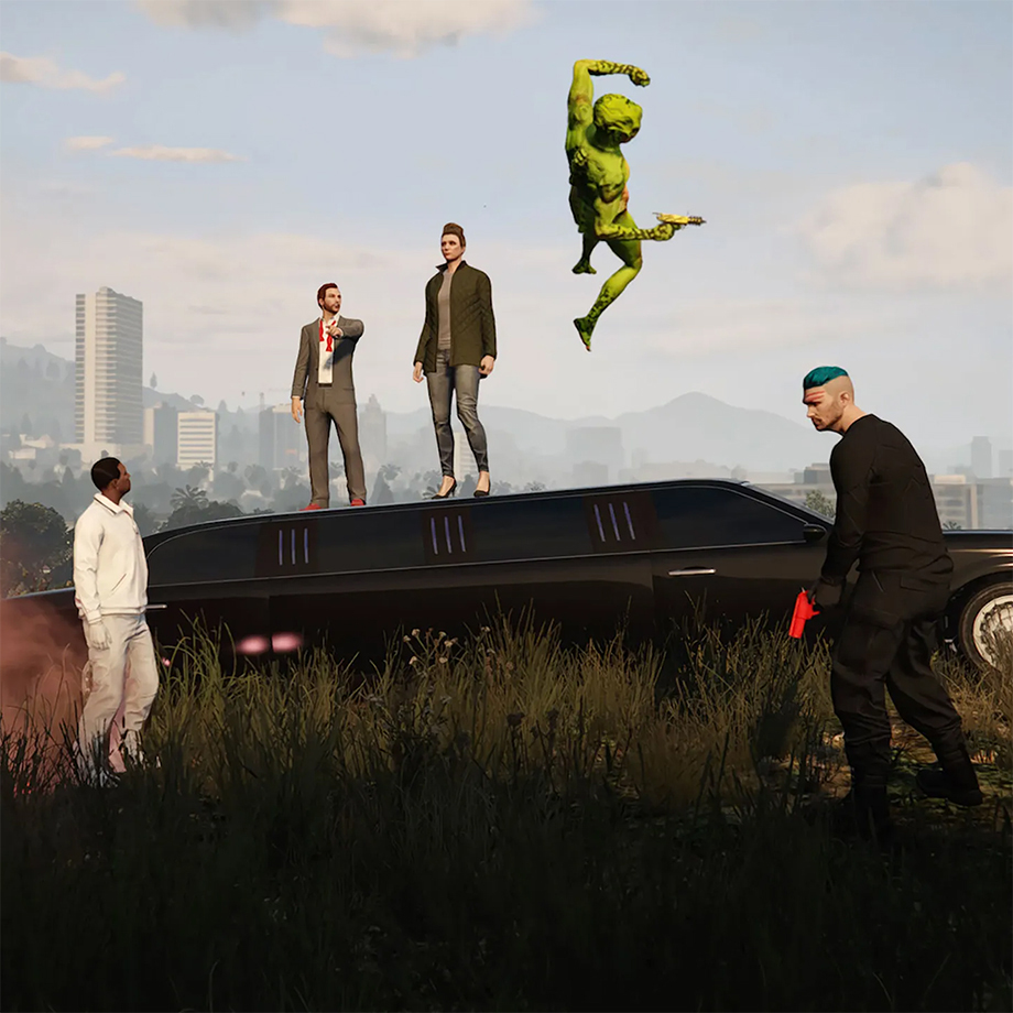 Image Description: Image containing 4 people (2 standing on top of a limosine, and 2 standing on the grass in front of the car), as well as one alien floating in the air