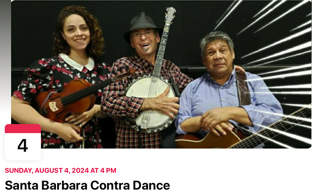 Contra Dance Rhythm Method Stringband/Jeff Spero calls Sun 8/4 – SB Carrillo Recreation Center 100 E Carrillo in the large ballroom with the sprung floor. $10 6-9pm