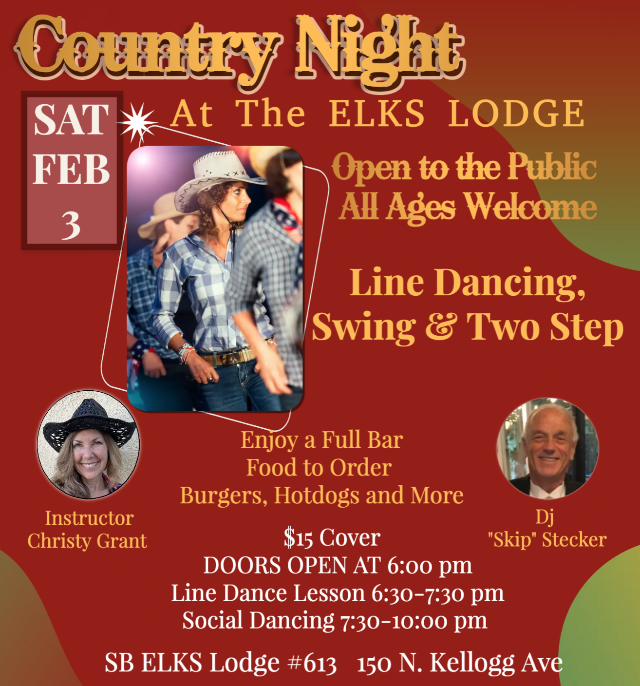 Dust off your boots and get ready for a boot-scootin’ good time at the Elks Lodge’s Country Night! Every First Saturday. We’re throwing open our doors to the public for an evening of line dancing, swing, delicious food, and refreshing drinks.