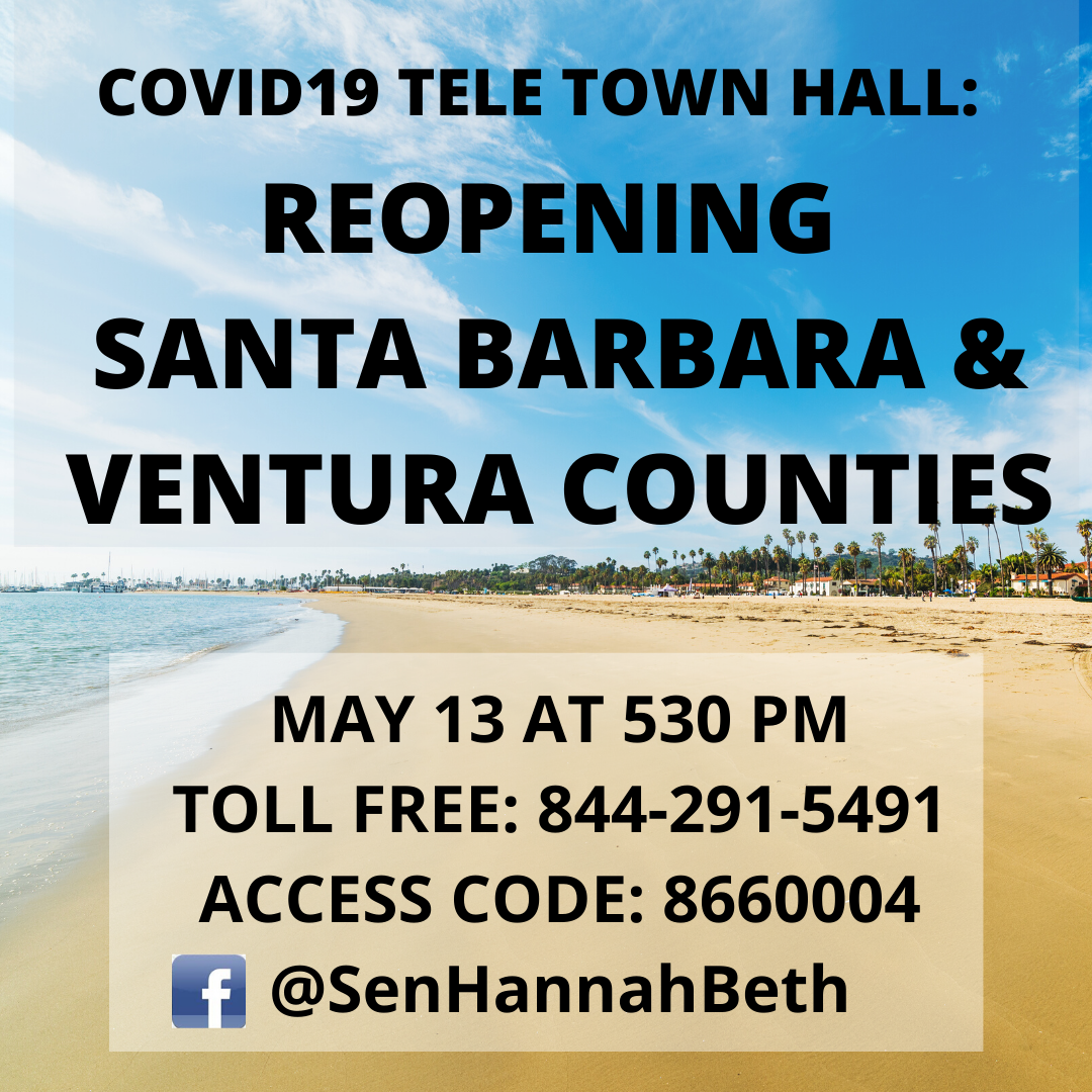 Please join Senator Hannah-Beth Jackson, Assemblymember Monique Limón, and Congressman Salud Carbajal as well as local public health officials for a teleconference town hall this Wednesday, May 13 at 5:30 p.m. to discuss the plan for reopening Santa Barbara and Ventura Counties.