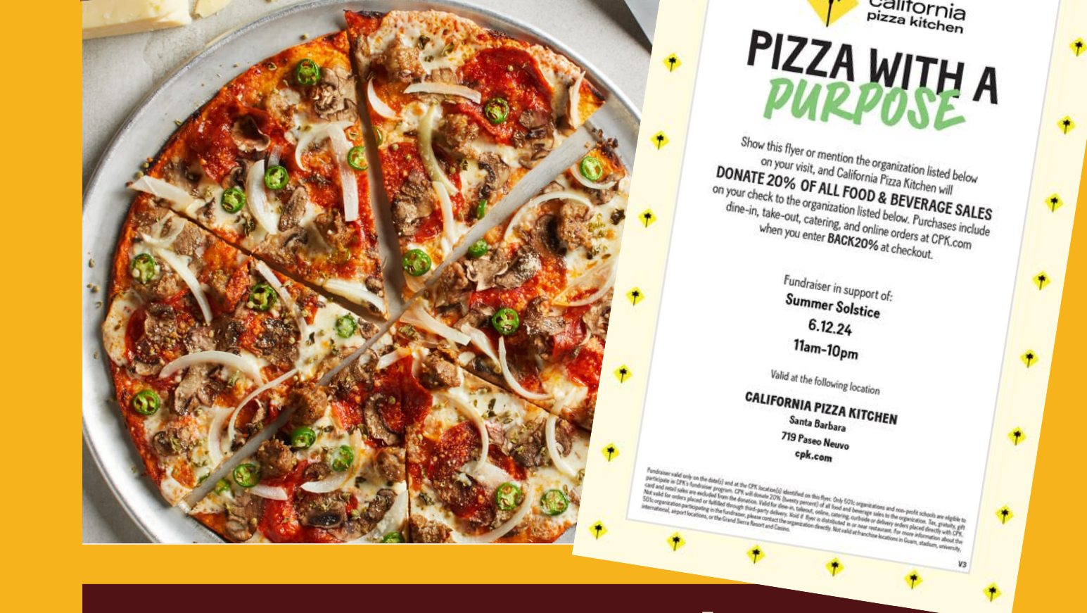 Come dine and drink at California Pizza Kitchen- Santa Barbara, in the Paseo Nuevo Shopping Center, on Wednesday, June 12, between 11 AM and 10 PM. Show the flyer or mention SUMMER SOLSTICE, and 20% of all food and beverage sales from your check will benefit Summer Solstice Celebration!