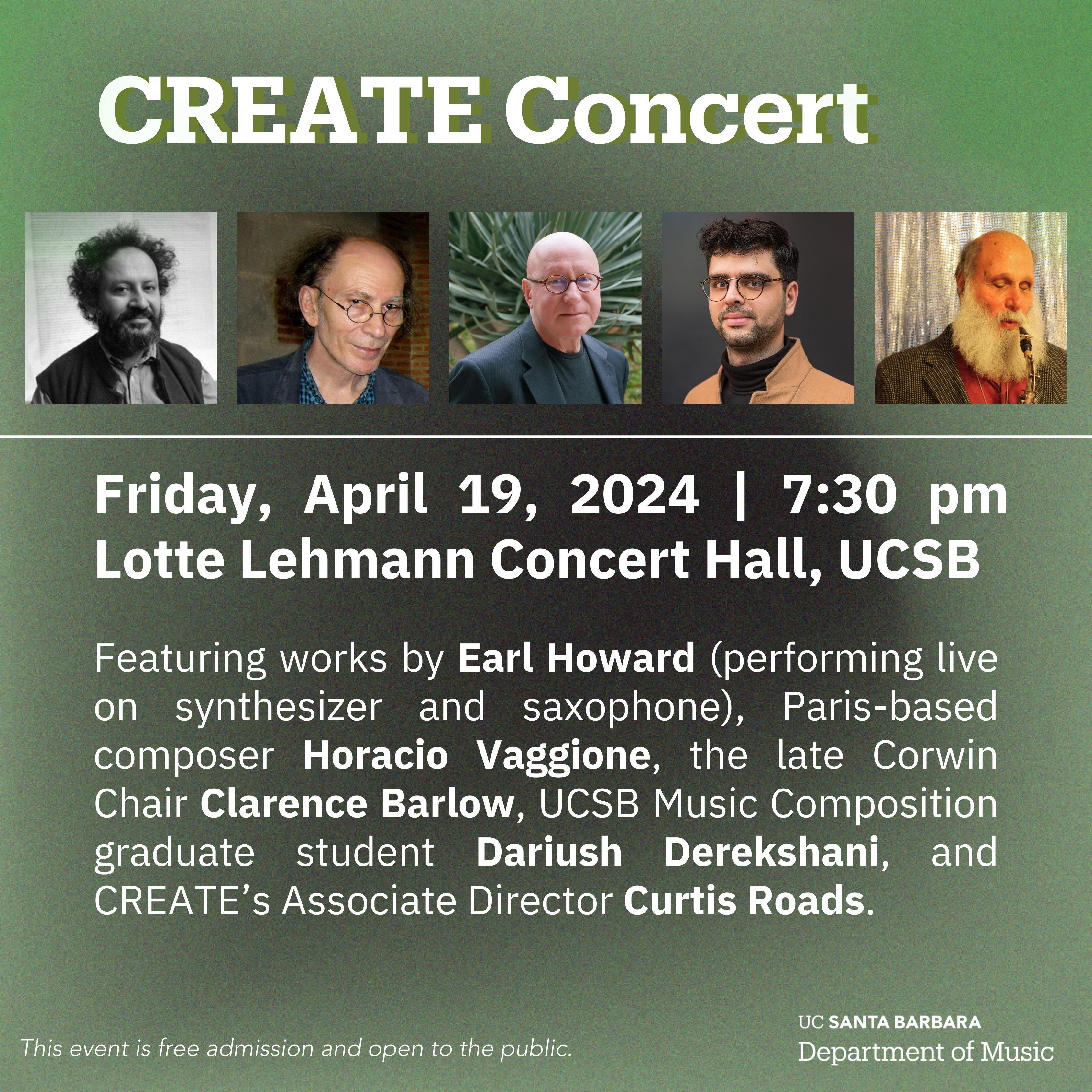 Friday, April 19, 2024 at 7:30 PM, Lotte Lehmann Concert Hall, UCSB featuring works by Earl Howard (performing live on synthesizer and saxophone), Paris-based composer Horacio Vaggione, the late Corwin Chair Clarence Barlow, UCSB Music Composition graduate student Dariush Derekshani, and CREATE’s Associate Director Curtis Roads.