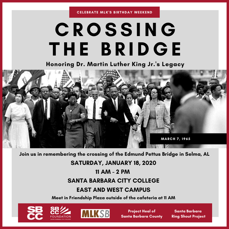 Celebrate MLK’s birthday weekend at ‘Crossing the Bridge’ an event honoring Dr. Martin Luther King Jr.’s legacy. Join us in remembering the crossing of the Edmund Pettus Bridge in Selma, AL on Saturday, January 18, 2020 from 11 a.m. to 2 p.m. at Santa Barbara City College’s East and West Campus. Meet in Friendship Plaza outside of the cafeteria at 11 a.m.