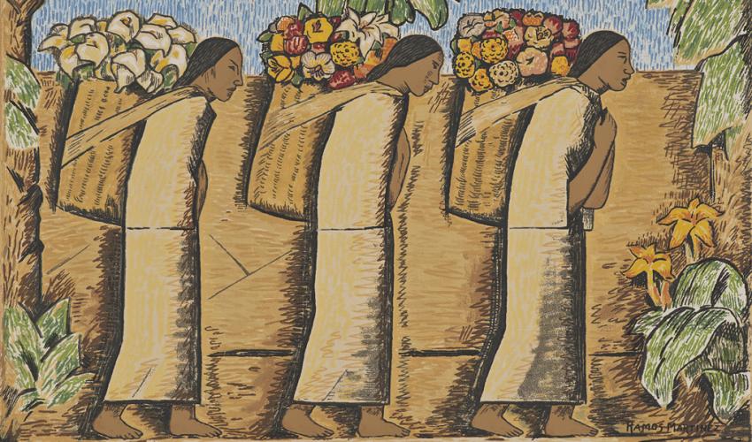 Image: Alfredo Ramos Martínez, printed by María Sodi de Ramos Martínez, Vendedoras de Flores (Flower Vendors), 1947. Serigraph / Serigrafía. SBMA, Gift of Charles A. Storke, 1994.57.23. © The Alfredo Ramos Martínez Research Project.