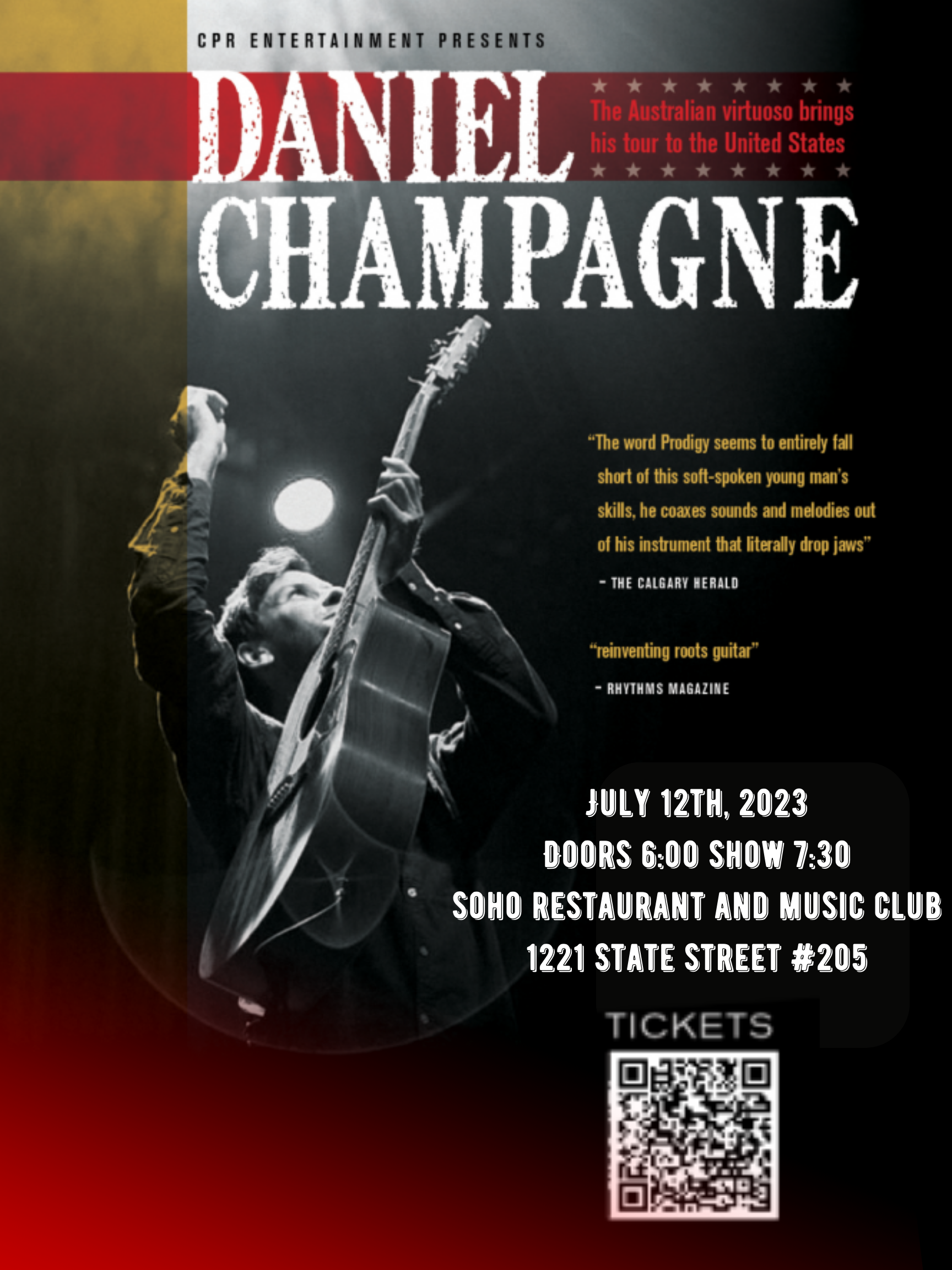 One reviewer recently wrote “Daniel Champagne exudes a natural ease on stage, as he sings poignant lyrics and beautifully crafted melodies that invariably whisk the heart up with grand romanticism. Coupled with an exhilarating guitar talent that transcends mere acoustic playing to replicate a whole band, Champagne must be seen to be believed’