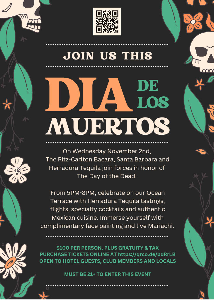 The event is $100 per person plus gratuity and tax. Tickets can be purchased online at https://the-ritz-carlton-bacara-santa-barbara.resortpass.co/ under “Day Pass” then “Day of the Dead Event”.