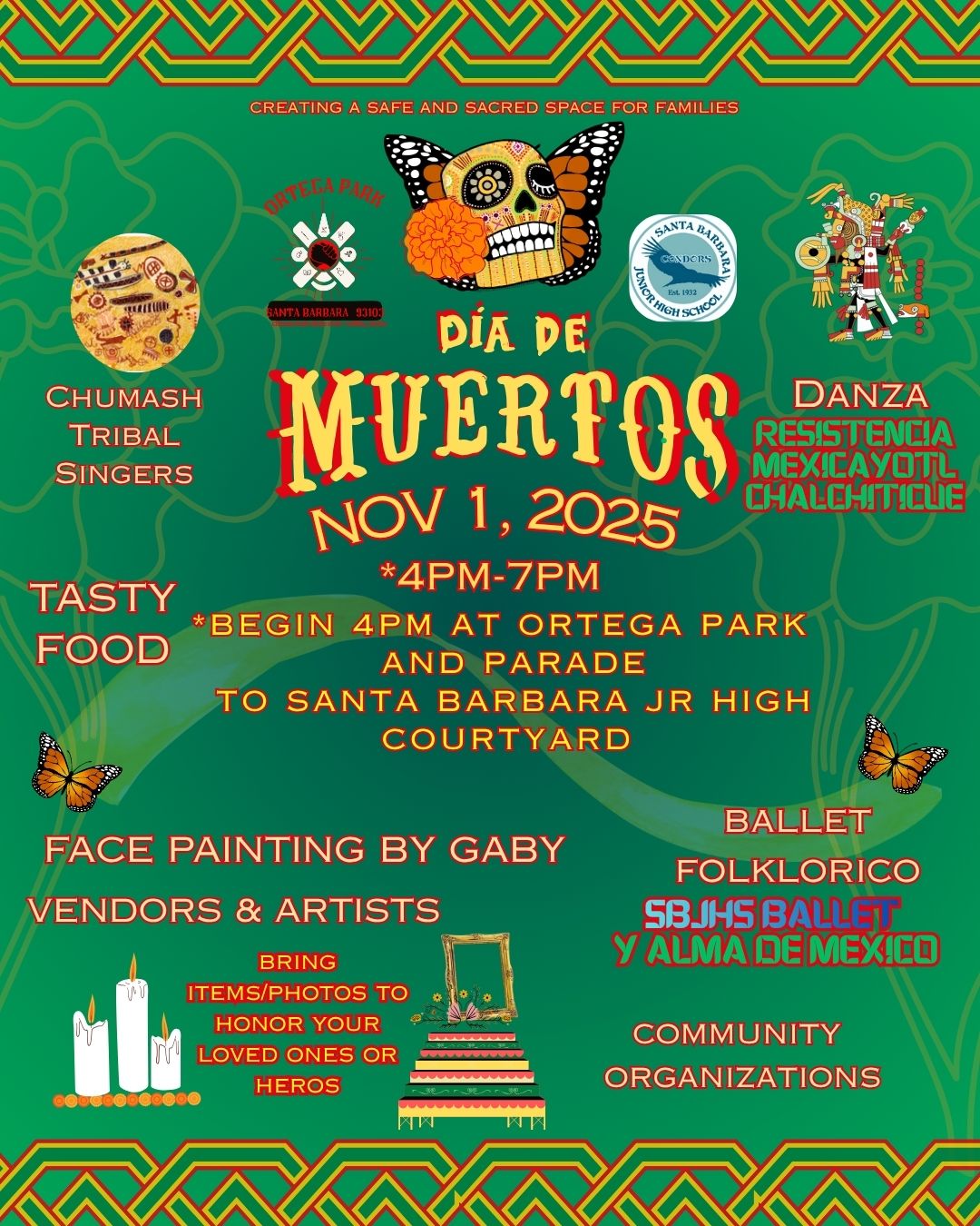 An evening of vibrant culture and cherished memories! The Ortega Park Steering Committee and Santa Barbara Junior High School invite you and your family to our 4th annual Dia de Muertos celebration. We’re proud to carry the torch forward, keeping the tradition started at La Casa de La Raza alive in our community. Join us as we Reclaim our traditions, Reconnect with our neighbors, and Remember our ancestors.