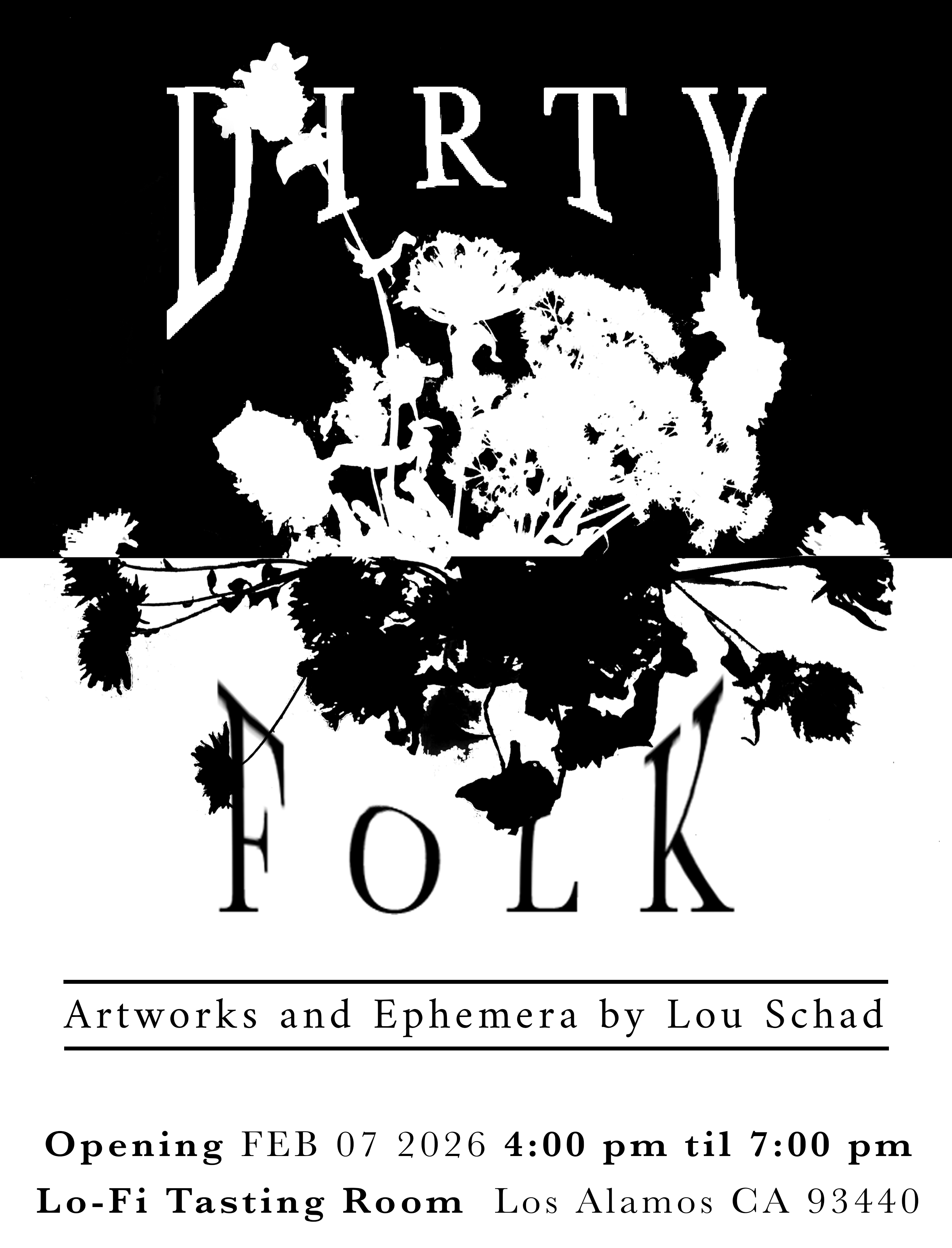 Los Alamos, CA — Dirty Folk is a solo exhibition of artwork and ephemera by Lou Schad, opening Saturday, February 7, from 4–7 PM at Lo-Fi Wines Tasting Room in Los Alamos.