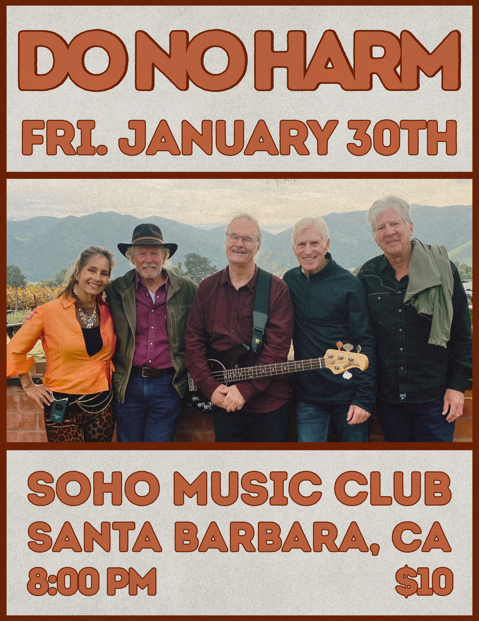Do No Harm is a lively five-piece party and cover band based in Santa Barbara, CA, known for playing a wide range of genres — including rock, soul, R&B, Motown, Latin, country, blues, and jazz