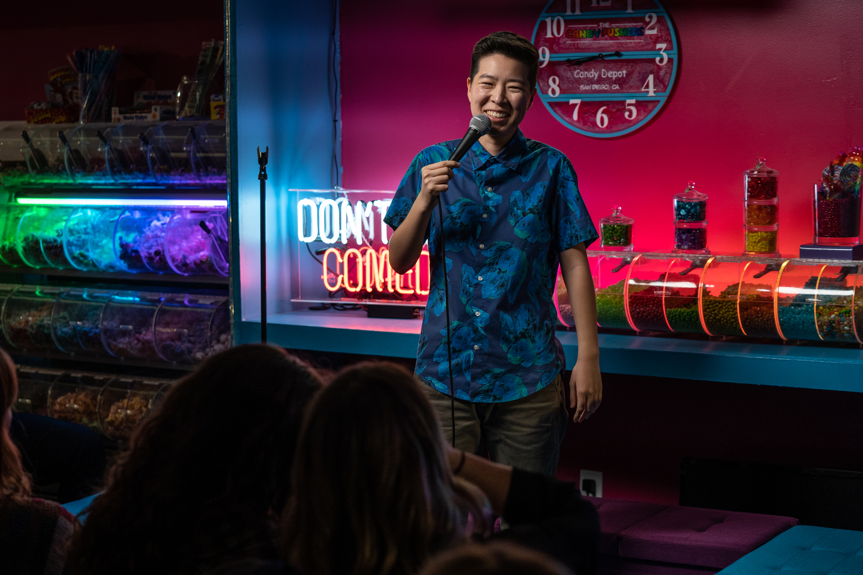 From historic mansions to candy stores, rooftops to rock climbing gyms, DTC transforms just about any environment into a unique setting for live stand-up comedy. The precise location, and other show details, are sent to ticket holders at noon the day of the show. You can bring your own drinks and snacks. Shows are run by a local team of comedy lovers and comedians who are passionate about creating a fun and relaxed environment for experiencing live comedy. There are no two drink minimums and each show is completely unique.