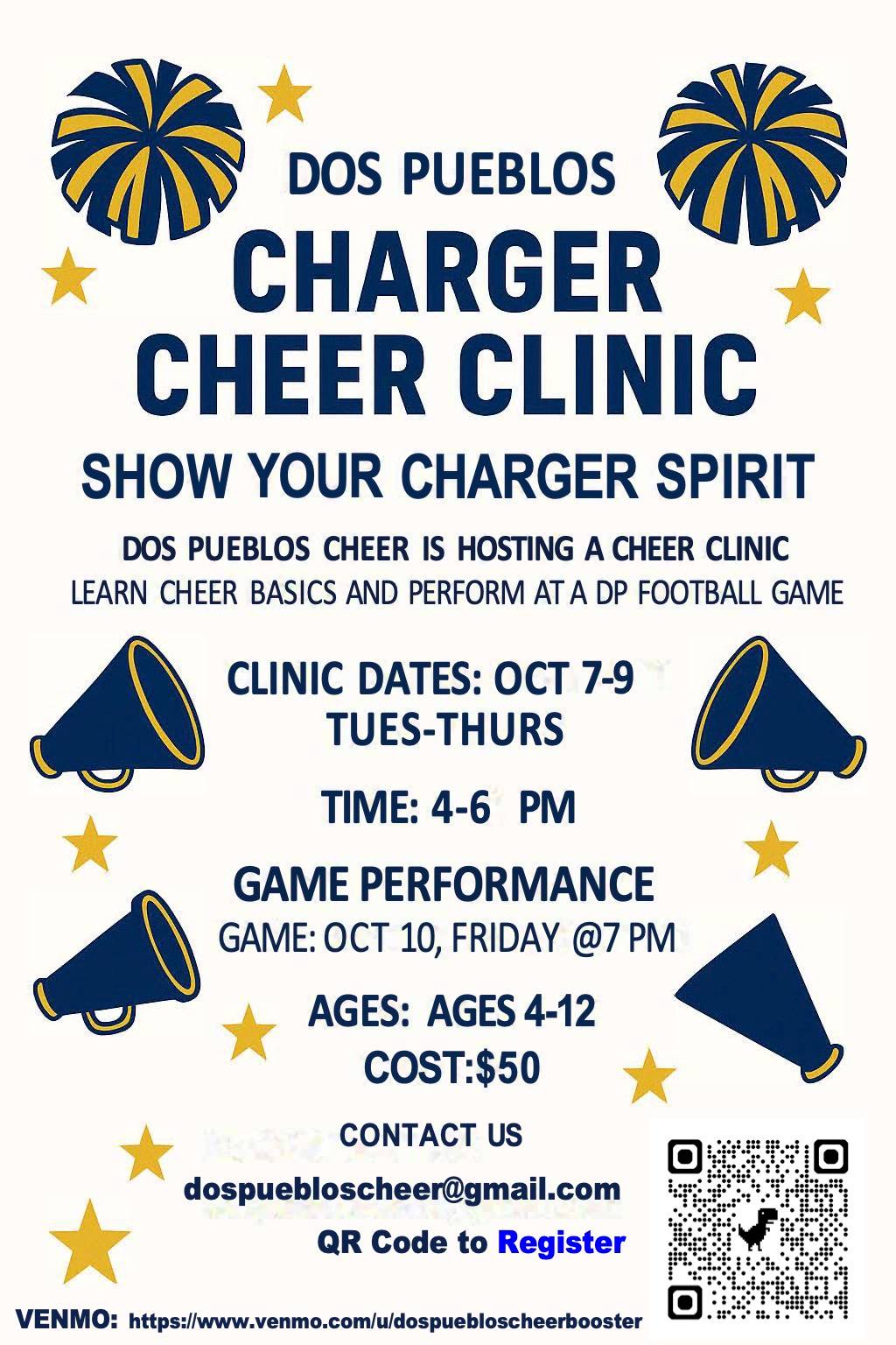 The Dos Pueblos High School Charger Cheer Team is excited to announce its upcoming Youth Cheer Clinic, open to all children in ages 4-12 (including Junior High). This fun and spirited event gives young athletes the chance to learn cheers, chants, jumps, and a short routine from the Charger Cheerleaders themselves.