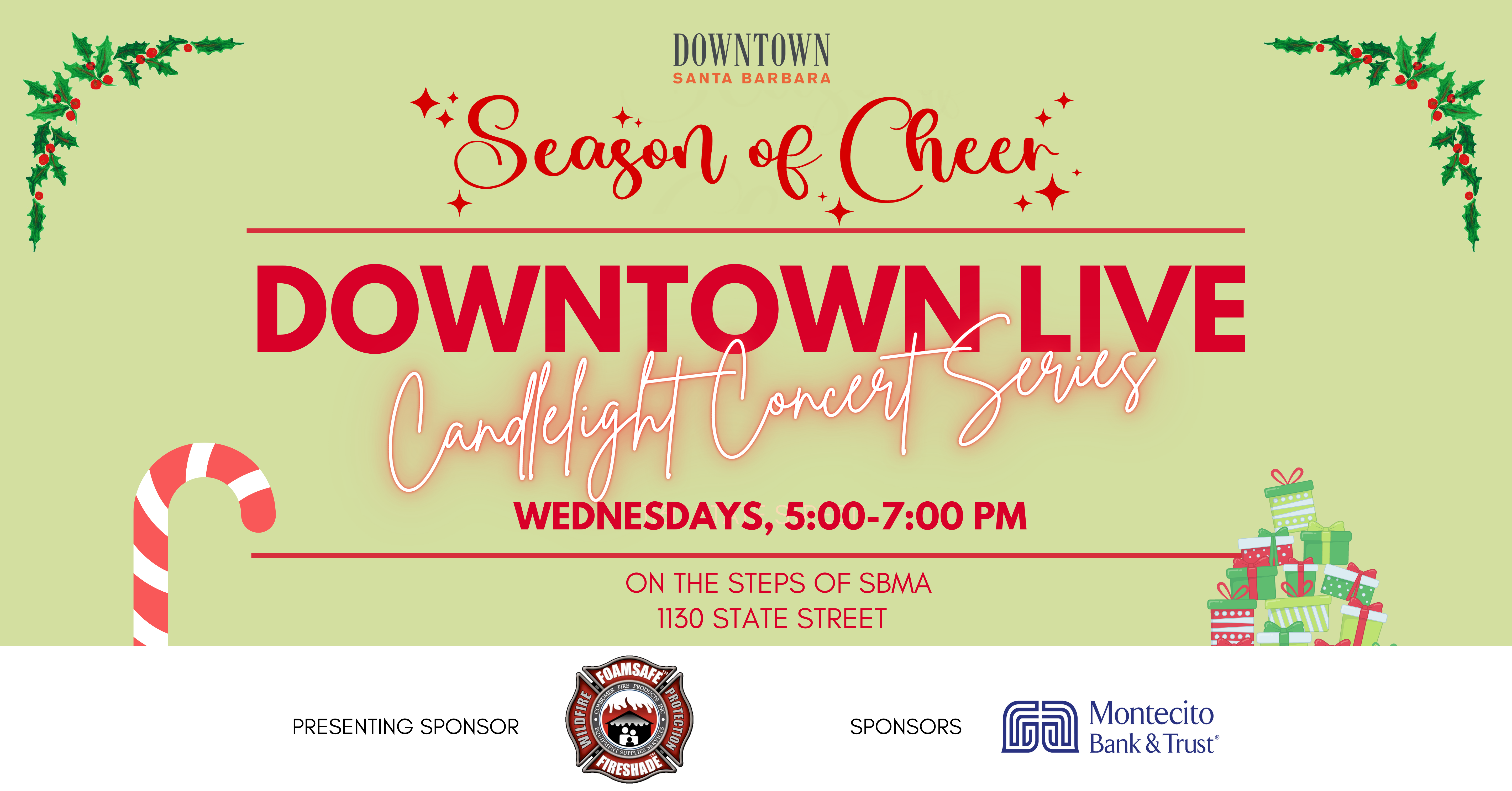 The first event in the Season of Cheer festivities Presented by Consumer Fire Products, Inc. Come and enjoy live entertainment on the steps of the historic Santa Barbara Museum of Art. Grab a delicious meal from one of the many nearby restaurants or a beverage at Mosaic Locale (Draughtsmen Aleworks, Old Town Coffee, Buena Onda Empanadas). Dress warmly and seating will be provided.