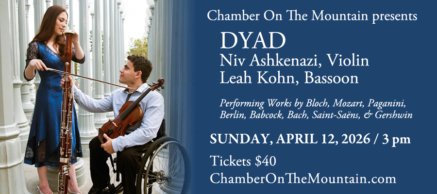 Dyad is an innovative violin and bassoon duo charting a path through unexplored musical territory. After meeting at Juilliard, bassoonist Leah Kohn and violinist Niv Ashkenazi were inspired to create a new kind of chamber music. Together, they have crafted engaging programs that reimagine classic works, premiere new pieces, and engage the imaginations of their audience. Since their first performance in 2015, they have performed on concert series and at major venues throughout the United States.