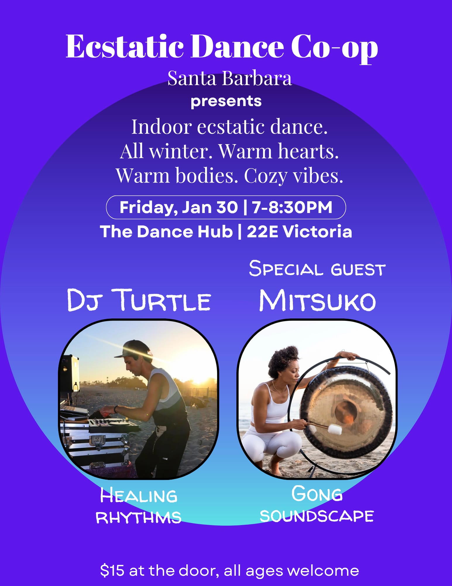 Join us for a magical night of dance, music, and sound. DJ Turtle, serving some healing rhythms, and our featured special guest Mitsuko, offering a deeply transformative 20-minute closing gong soundscape.