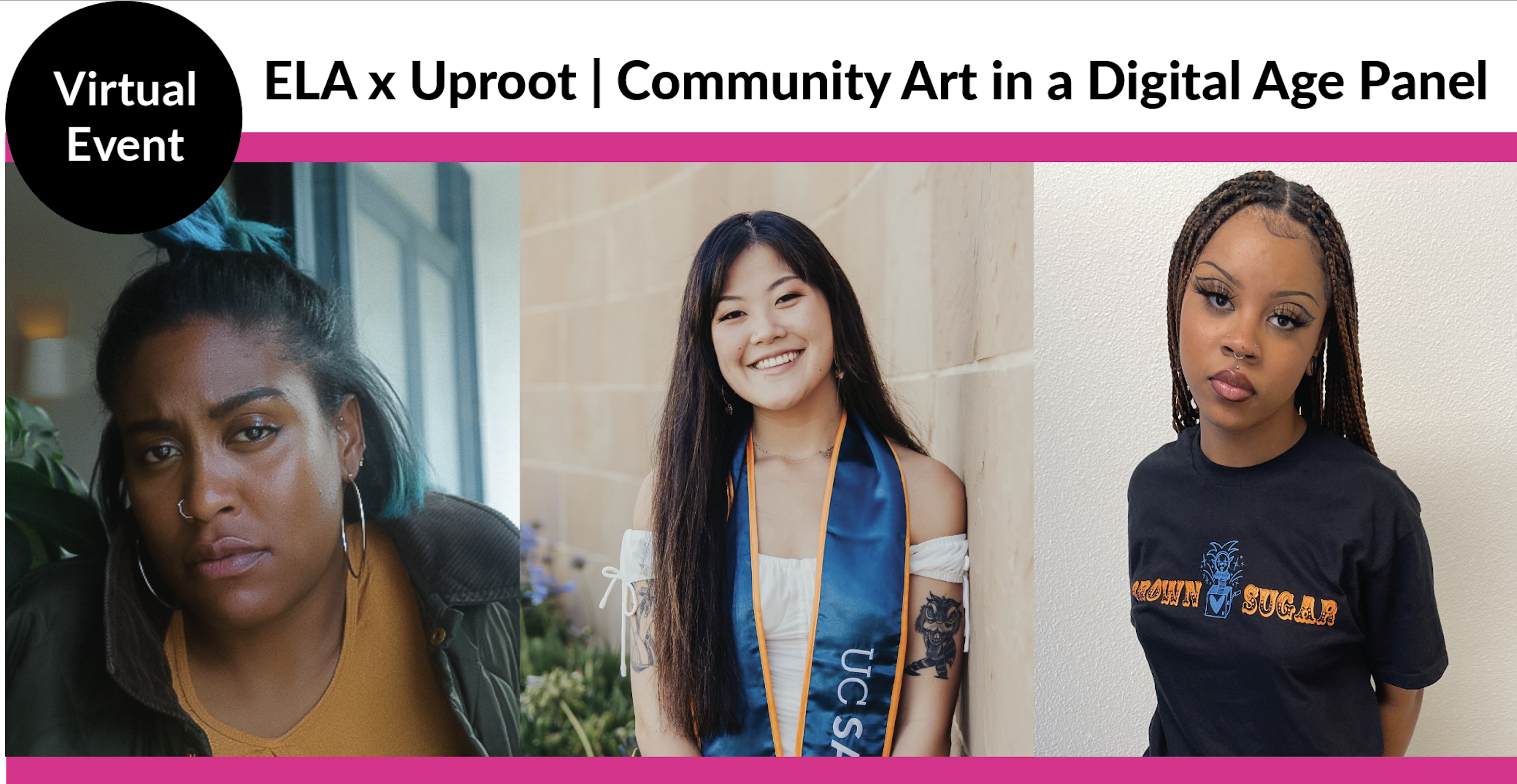 Join us for a virtual conversation highlighting Uproot Artist Coalition with artists Harvest Keeney, Leah Moment, and Amanda (Mandy) Harris Williams. Moderated by ELA Fellow, Tess Reinhardt, the artists will discuss community and art in the digital age.xf