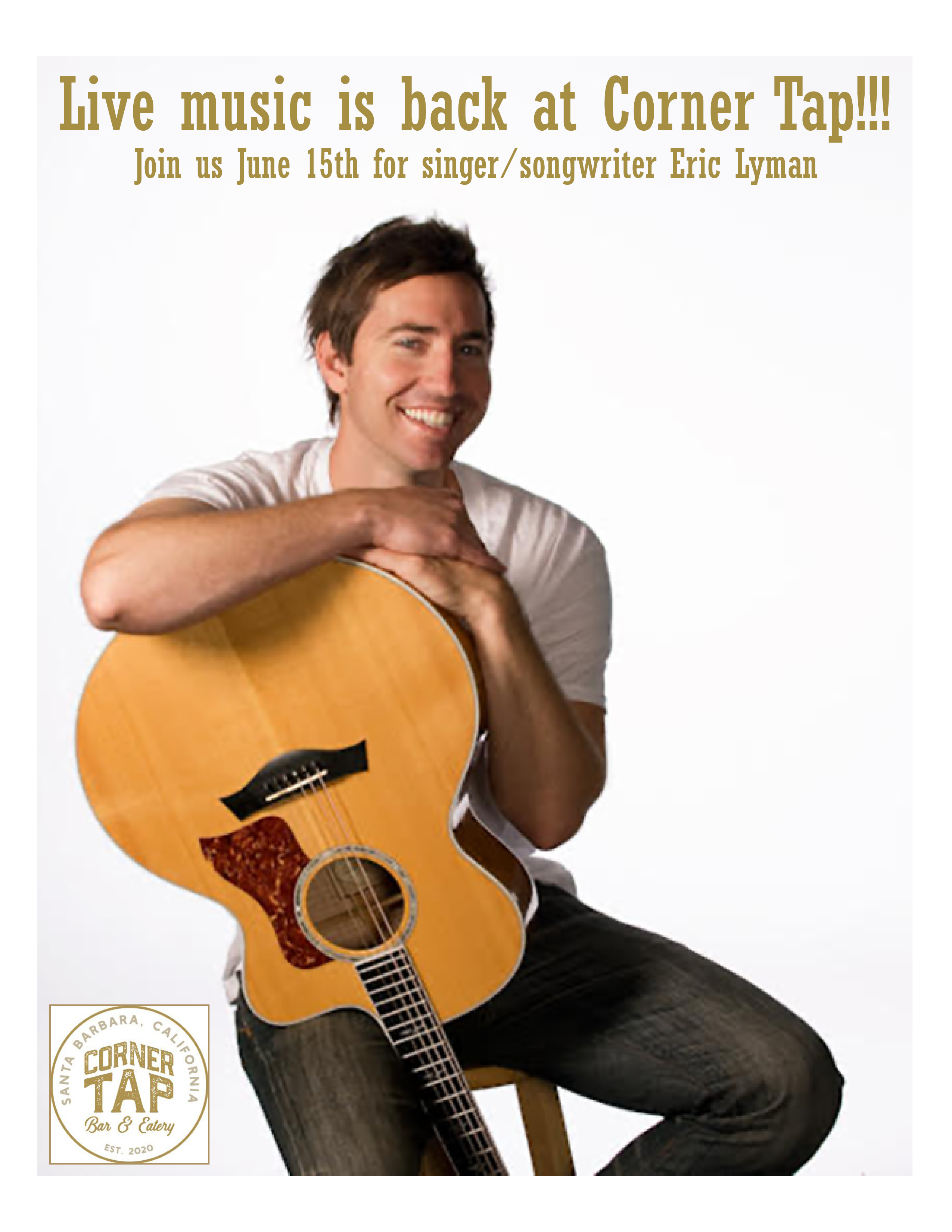 Corner Tap has officially re-opened and we’re kicking off our live music events again with one of our favorite local artists, Eric Lyman! Join us Thursday, June 15, at 7pm for some gourmet-style gastropub grub, great cocktails, soul-quenching tap beers and the talented singer/songwriter, Eric Lyman, jamming on some fun, acoustic style crowd tunes!