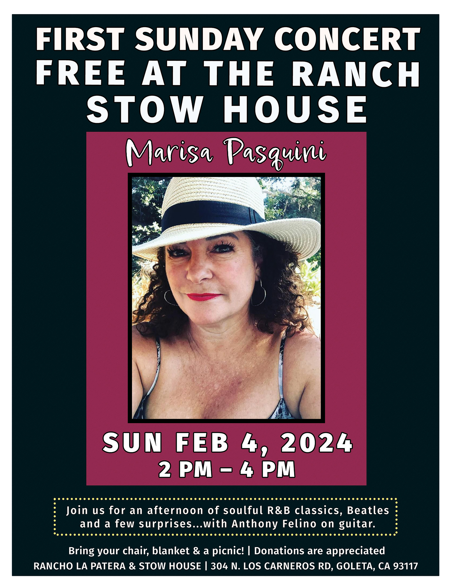 Join the Goleta Valley Historical Society as we welcome Marisa Pasquini to the Stow House lawn for an afternoon of soulful R&B classics, The Beatles, and a few surprises… with Anthony Felino on guitar. Pack a picnic, relax on your blanket or chair, and enjoy the grooves!